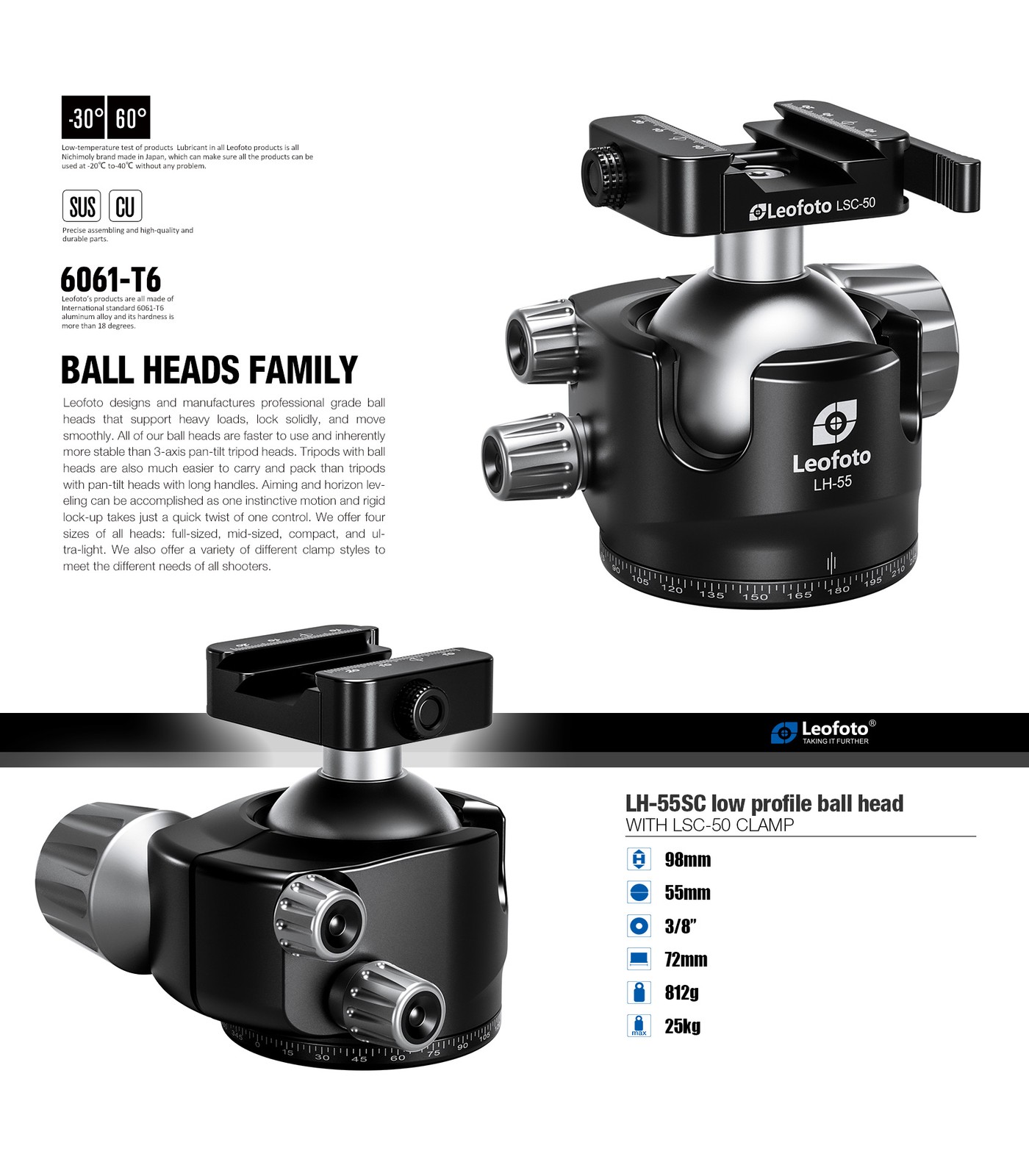 Leofoto LH-55SC Tripod head Ball head 55mm Low Profile dual clamp Arca/Picatinny