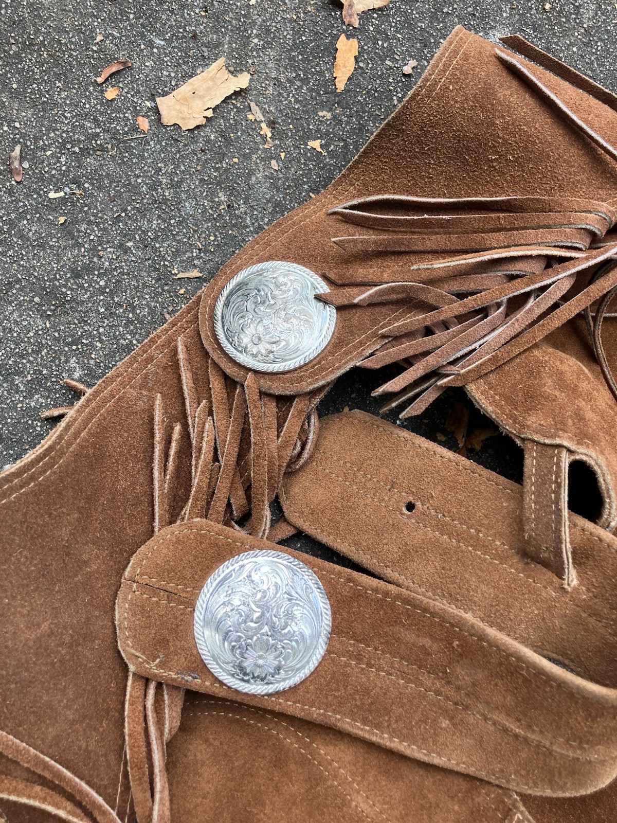 как выглядит Vintage Suede Rodeo Worn Western Cowboy Chaps Fringed Concho 60 s фото