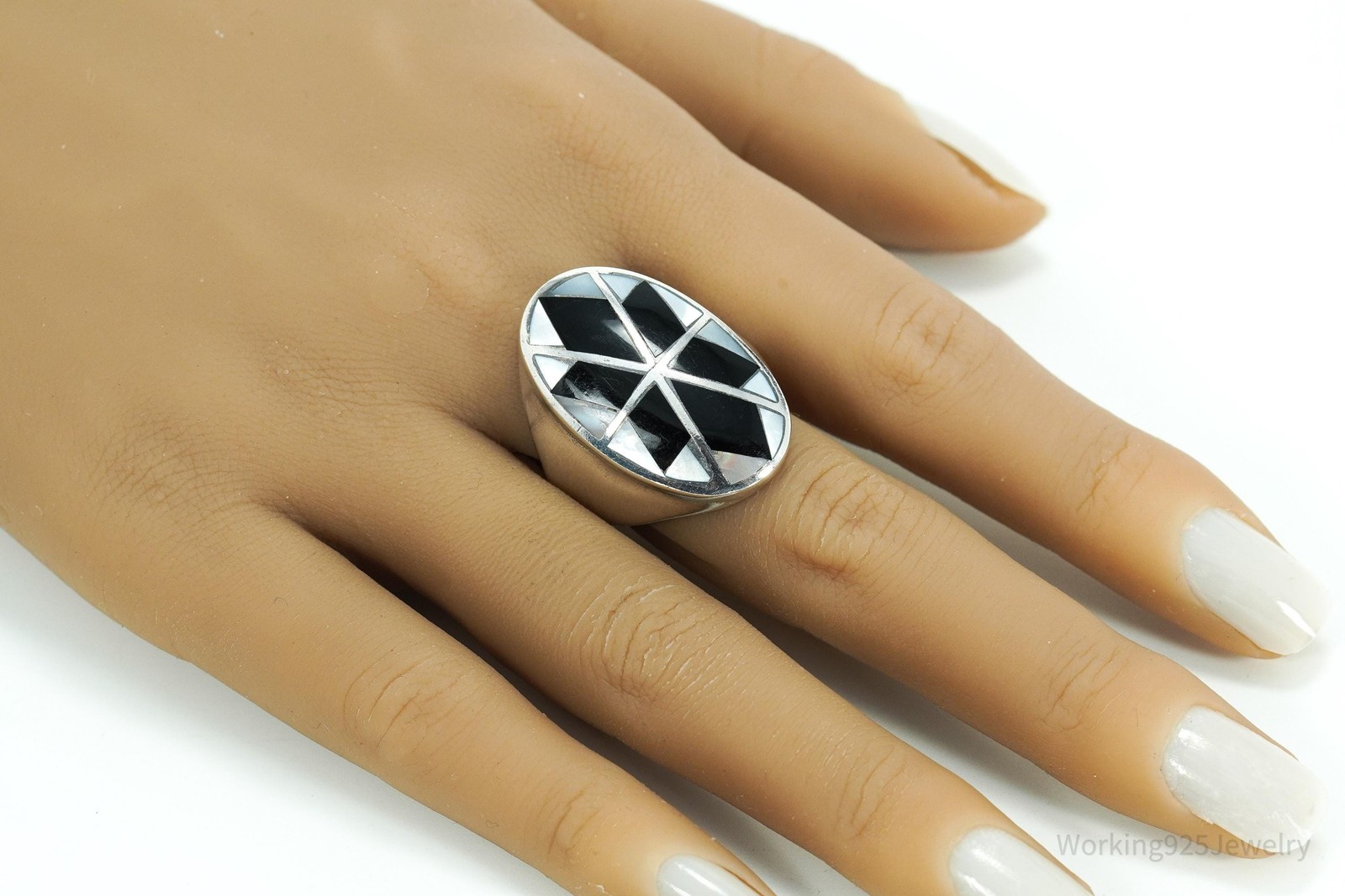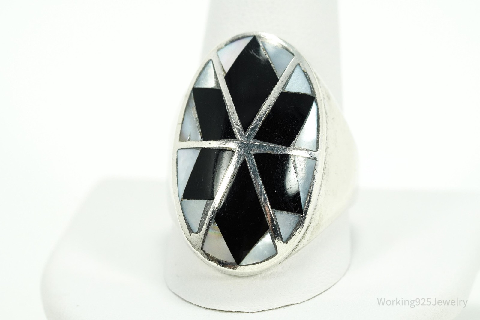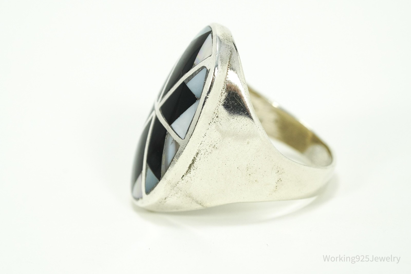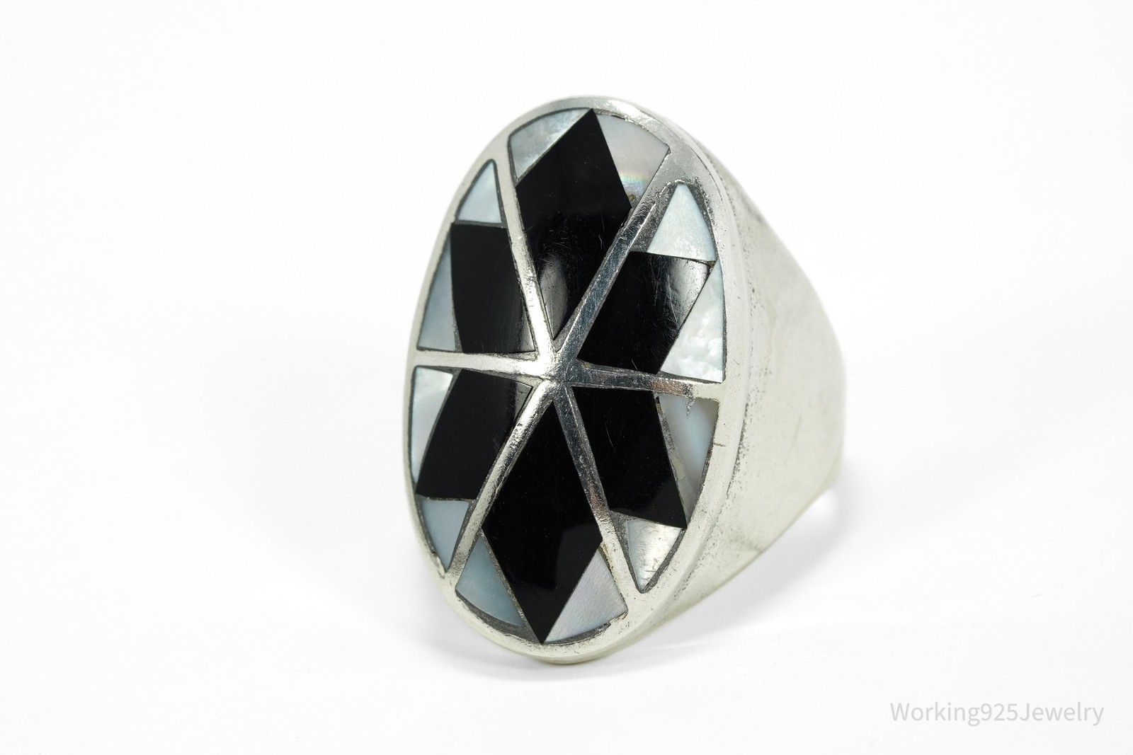 Vintage Mother Of Pearl Black Onyx Inlay Silver Ring - Size 11.5