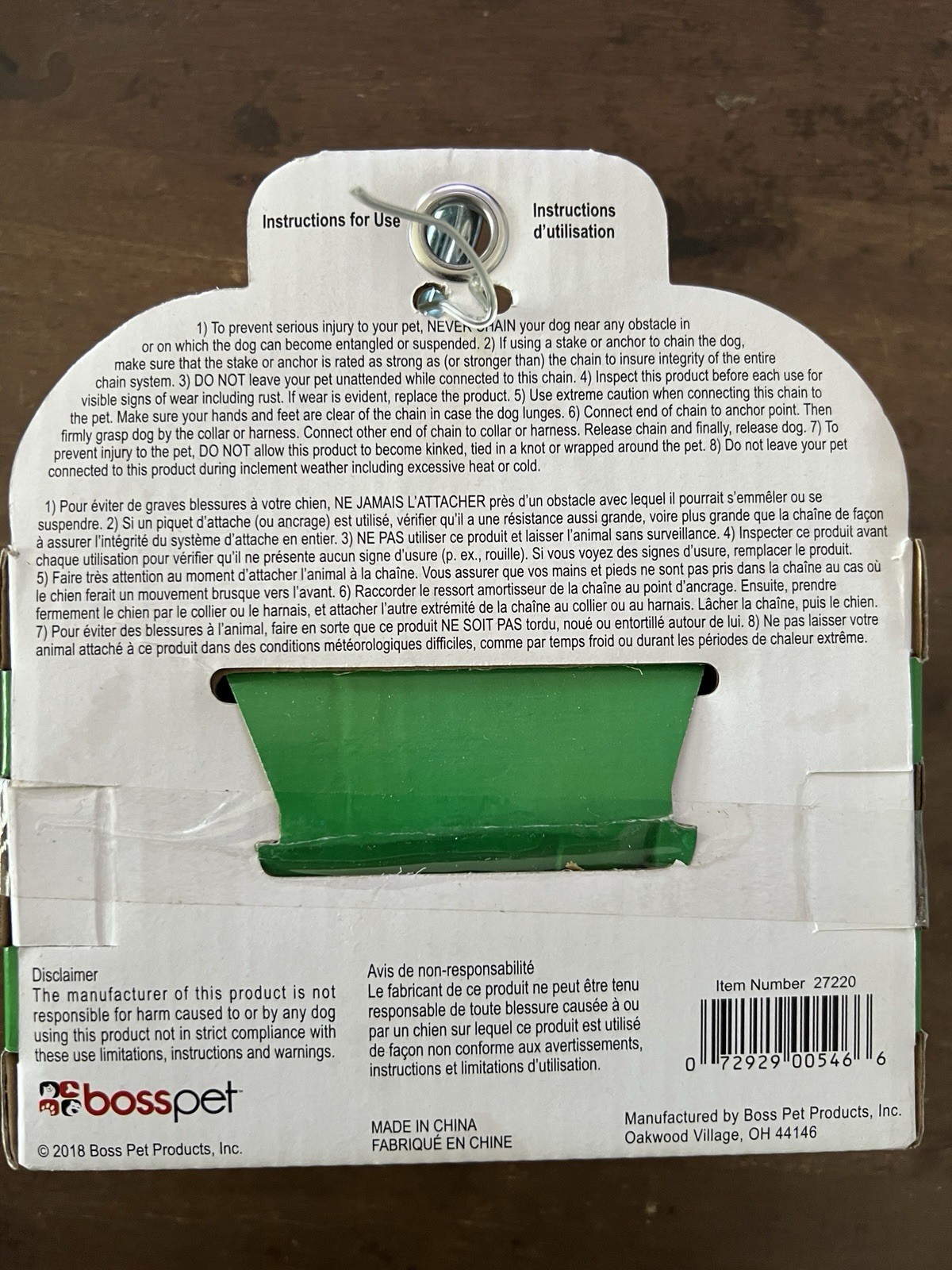 Boss Pet 20 Foot DOG TIE OUT CHAIN Silver Steel Snap-35 lbs Dogs NEW in Box