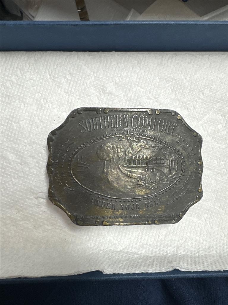 как выглядит VINTAGE 1970s BERGAMOT SOUTHERN COMFORT BRASSTONE BOOZE BUCKLE фото