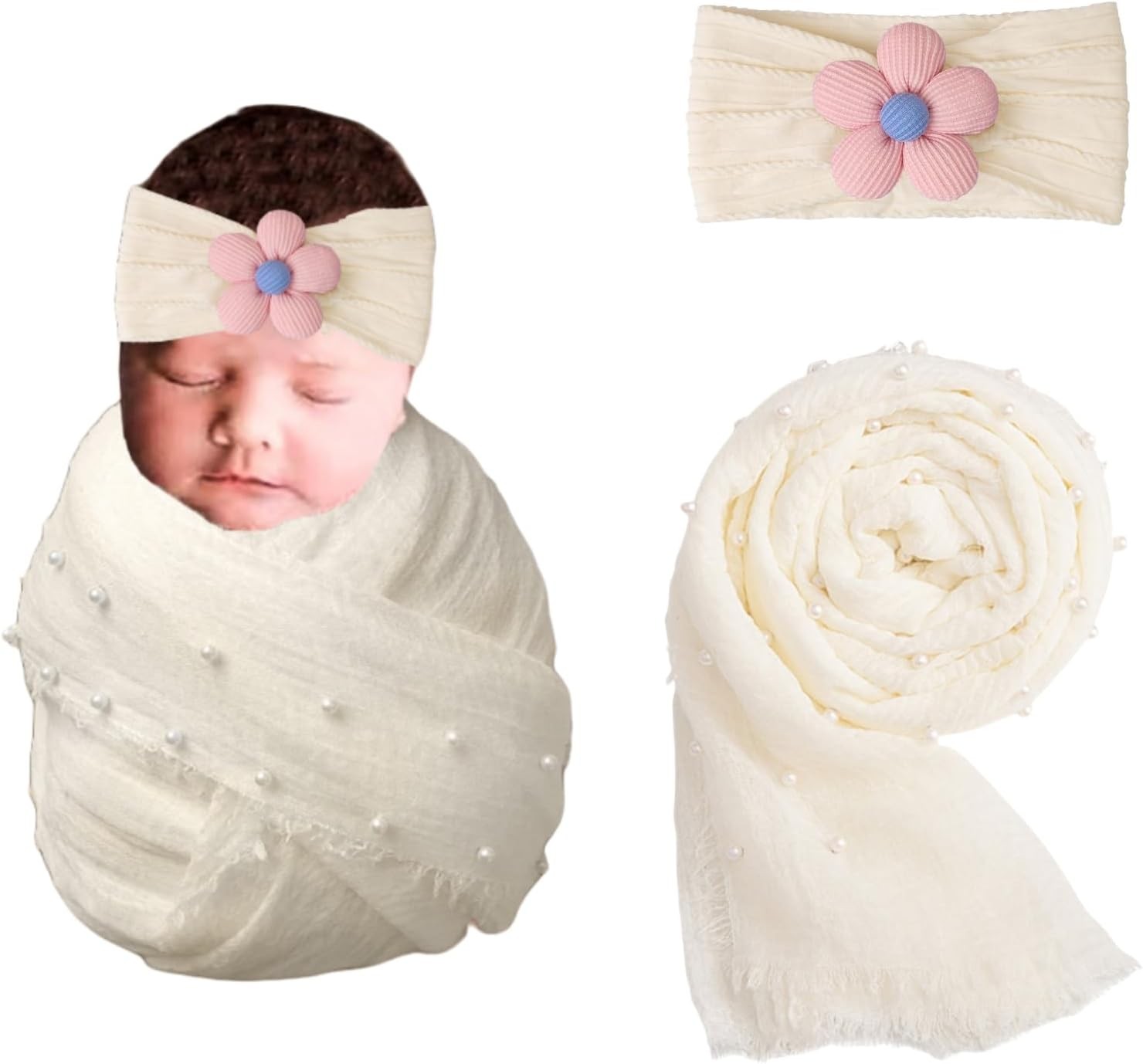 2 PCS Newborn Photography Wraps with Pearl Headband Baby Photo Props Pale Pink G