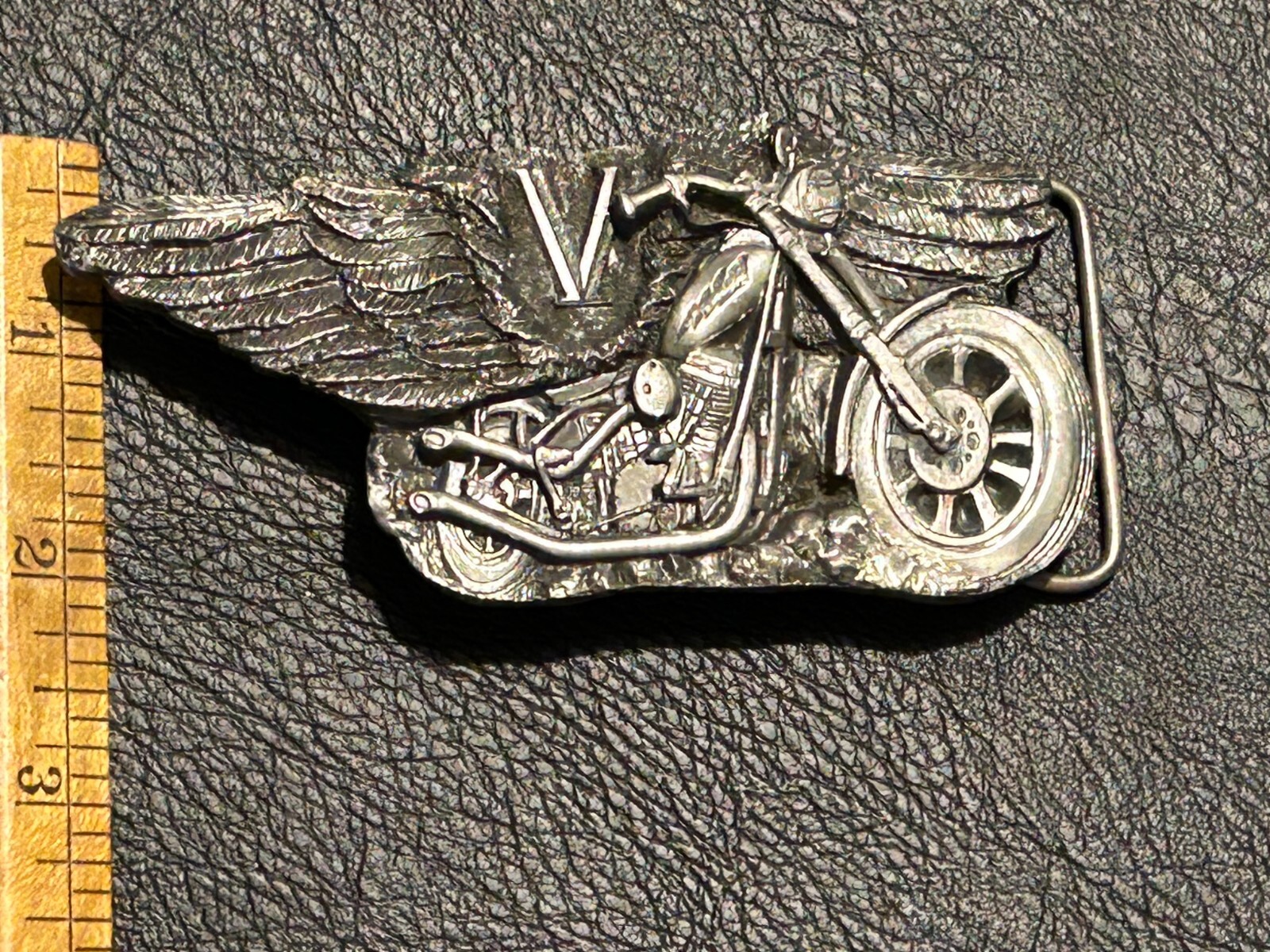 как выглядит 1986 WINGED CHOPPER "V" MOTORCYCLE BELT BUCKLE, pewter, C J, inc. USA фото