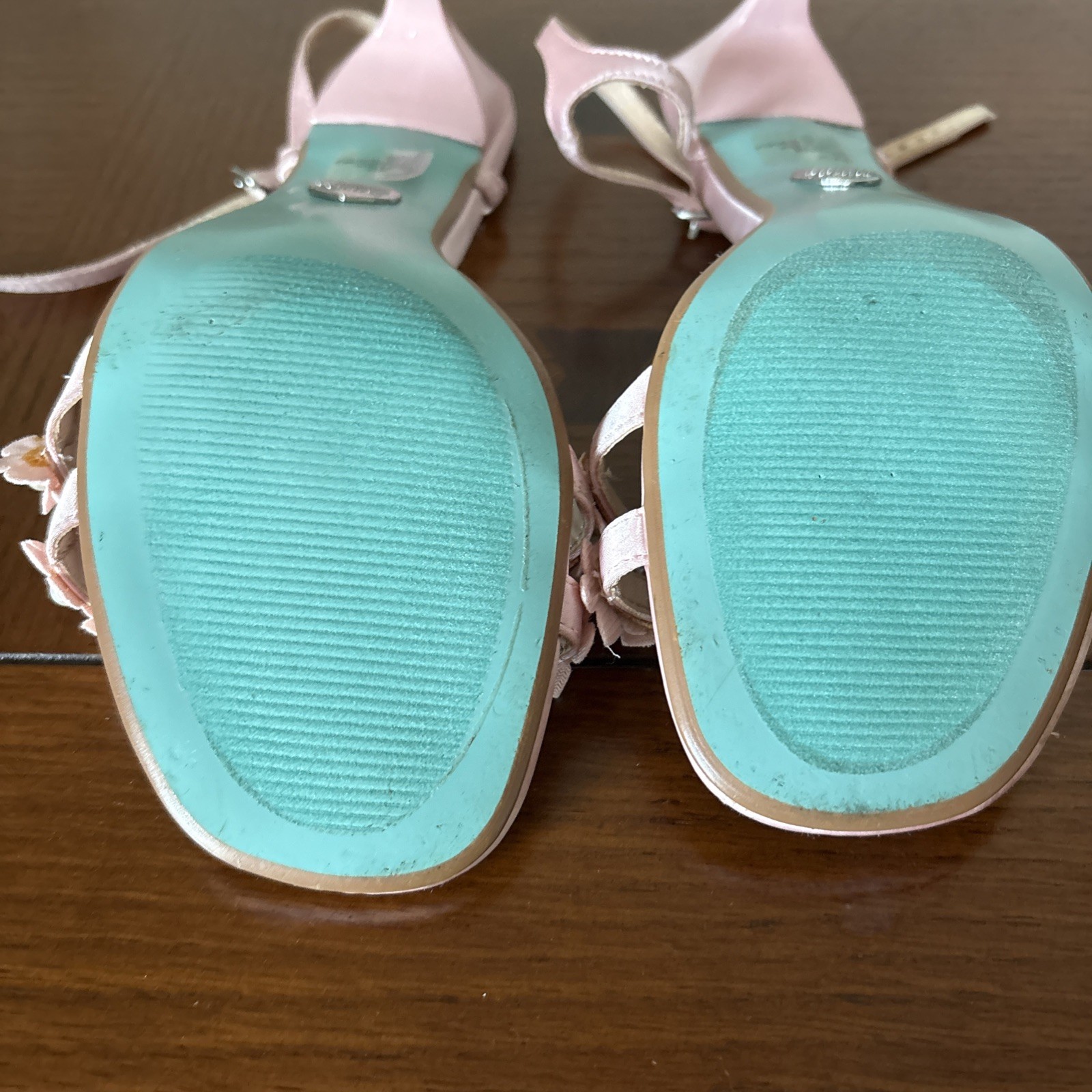 как выглядит betsy Johnson pink strappy sandal heels with flowers and pearls womens size 10 фото