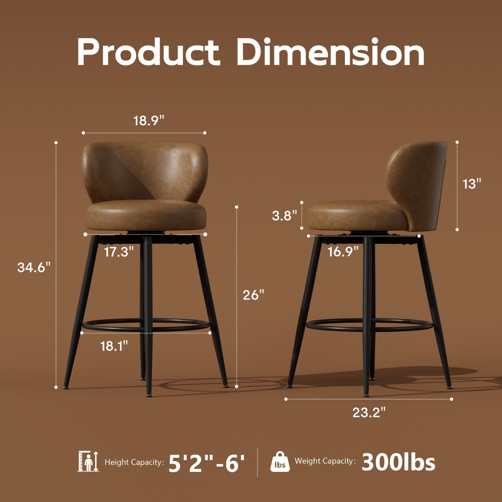 26 Leather Bar Stools Set of 2 Swivel Counter Height Chairs with Metal Frame
