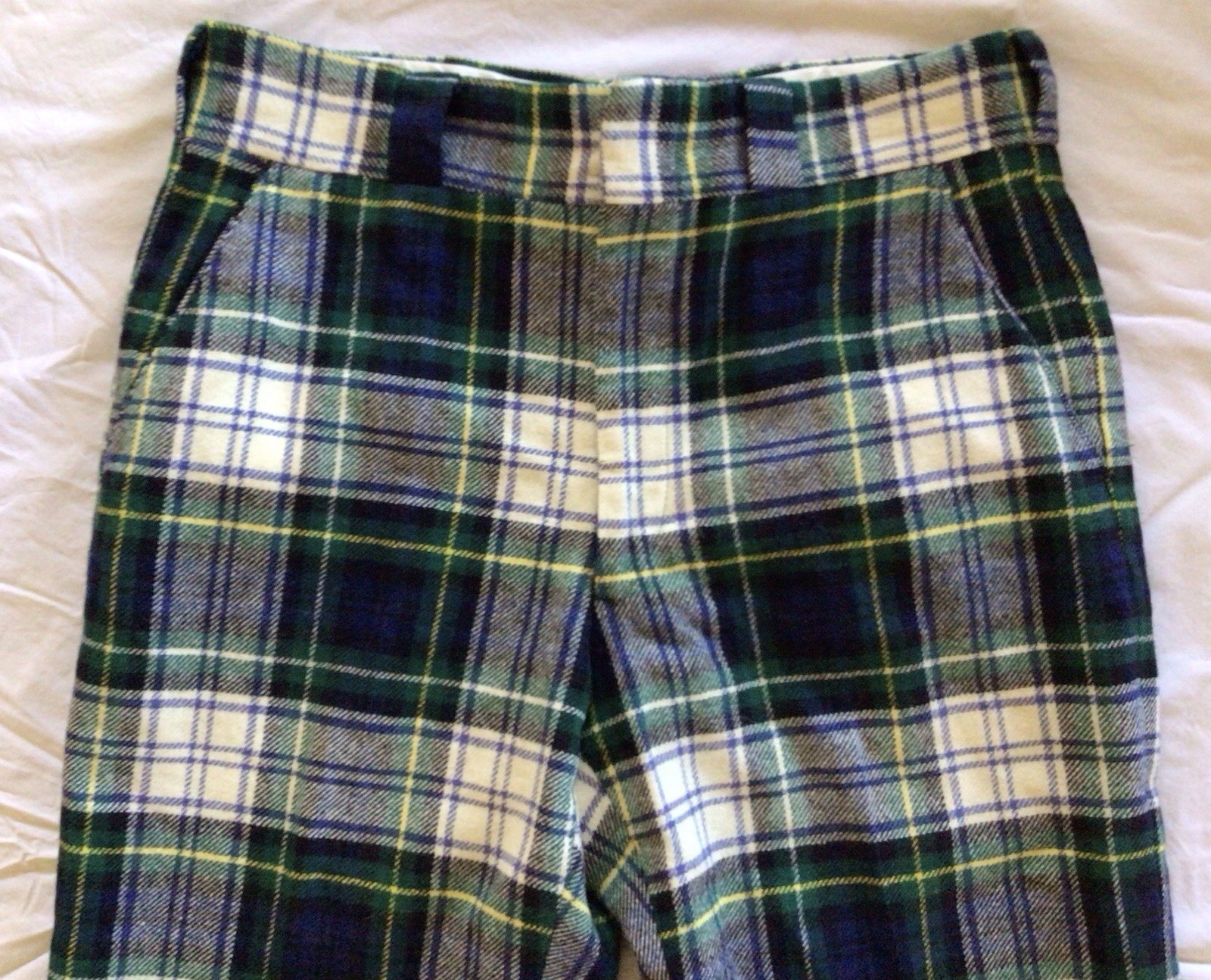 как выглядит Vintage 70 s Mens W34 L31 Blue Tartan Plaid Wool Cuffed Flare Bell Bottom Pants фото