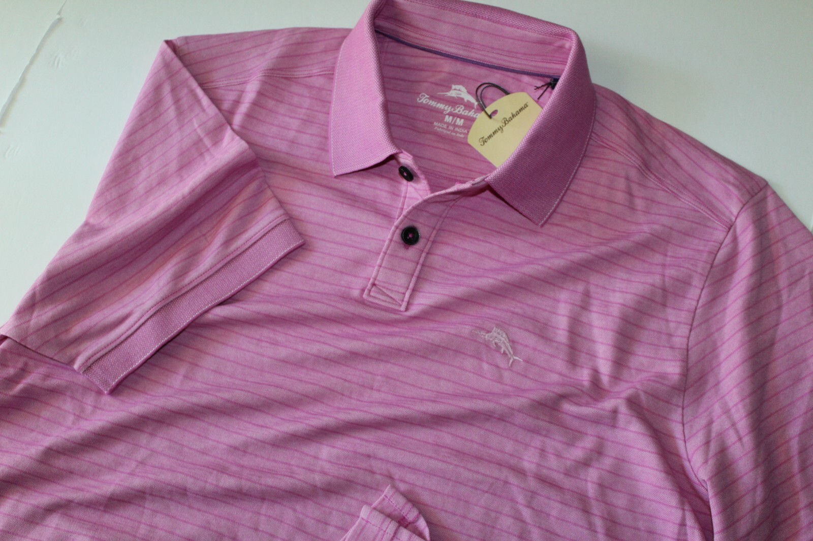 как выглядит Tommy Bahama Polo Shirt B Coral Stripe Nebula Purple Logo SS New Medium M фото