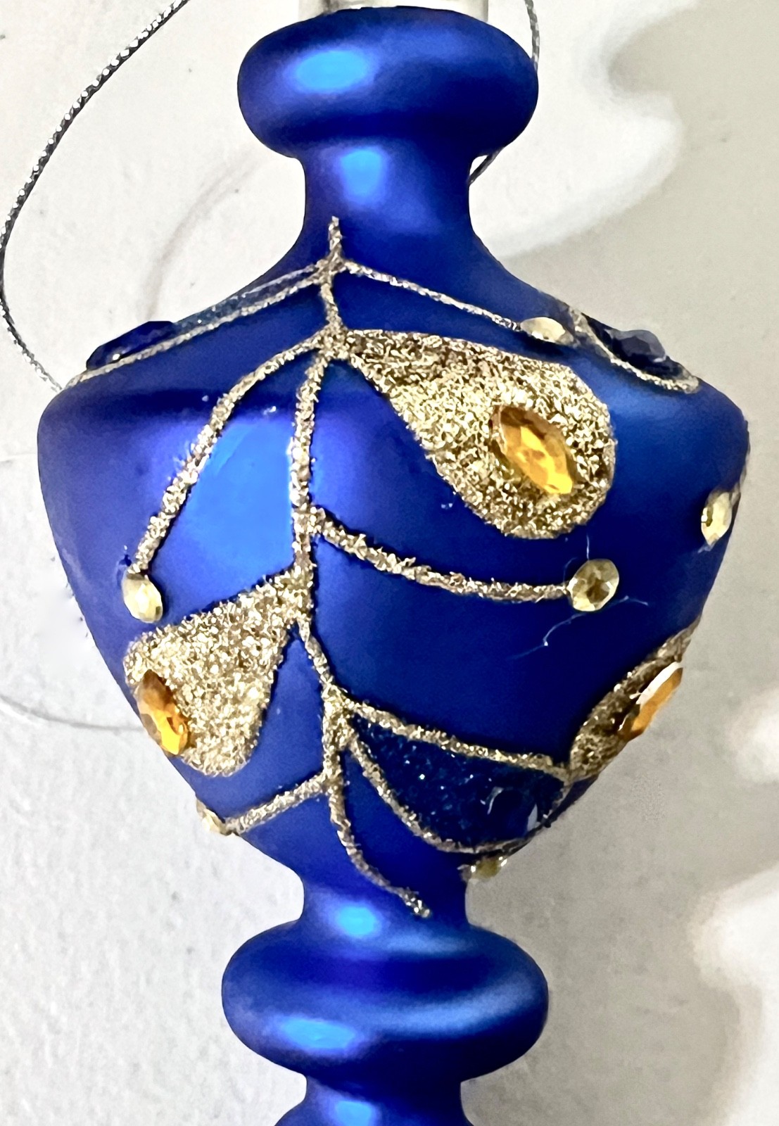 • Blue Finial Glass Christmas Ornament Gold Blue Glitter w/Rhinestones 2/2