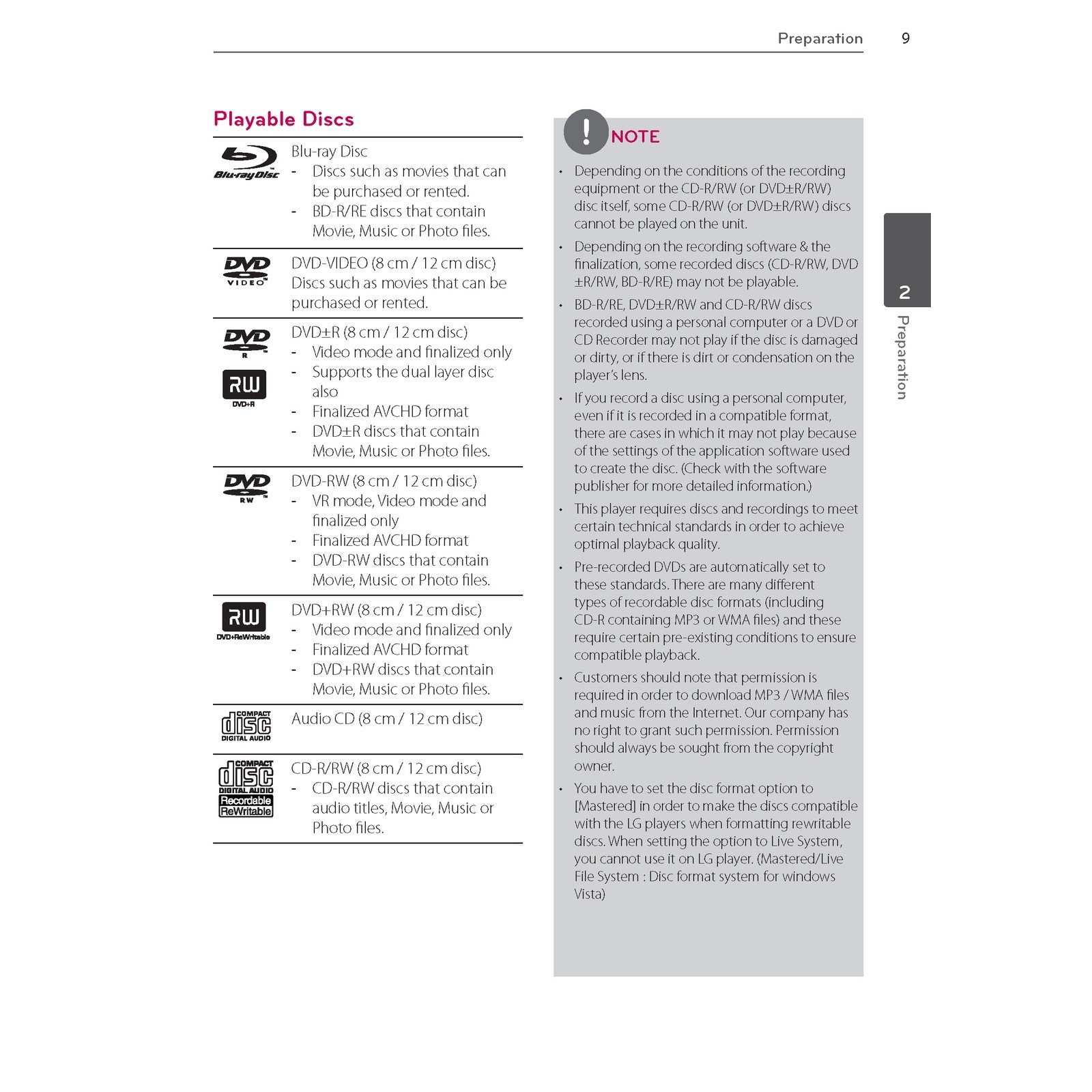 Playable Media Format: BD-R, Blu-ray BD-R, DVD, DVD-RW, DVD+RW, CD