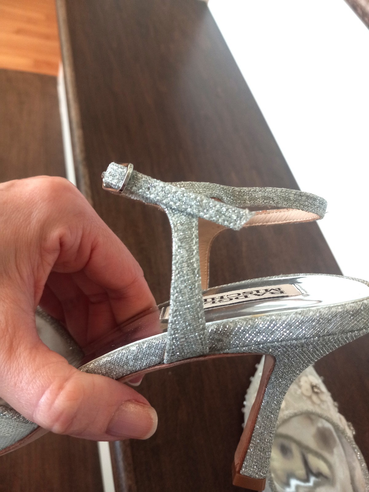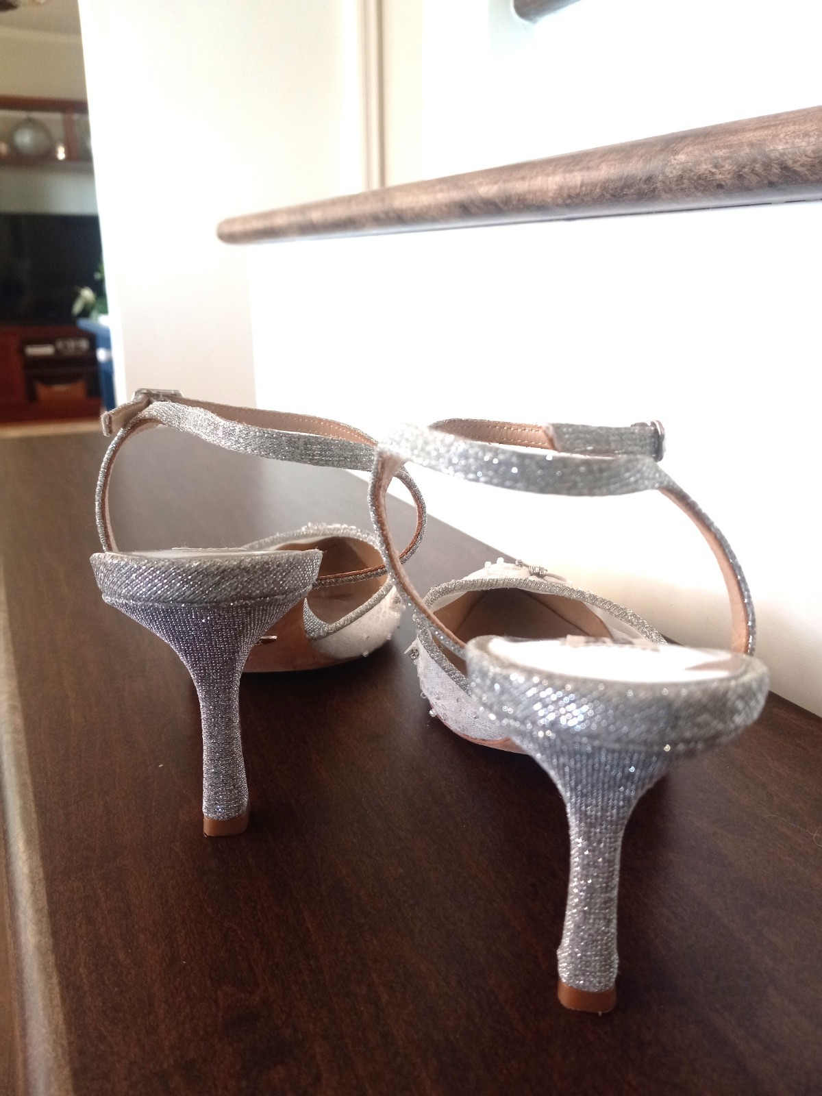 как выглядит Badgley Mischka Silver White Floral Wedding Shoes Embroidery Mid Heel Size 7 фото