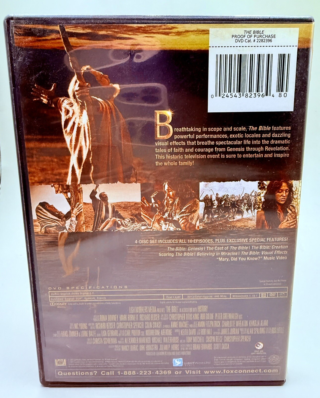 Особенности: Widescreen, FACTORY SEALED!, Authentic Region 1 USA (not burned), English, French, & Spanish Subtitles, "The Bible: Genesis" Featurette, "The Cast of The Bible" Featurette, "The Bible: Creation" Featurette, "Scoring The Bible" Featurette, "Believing in Miracles" Featurette, "The Bible: Visual Effects" Featurette, " Mary, Did You Know?" Music Video