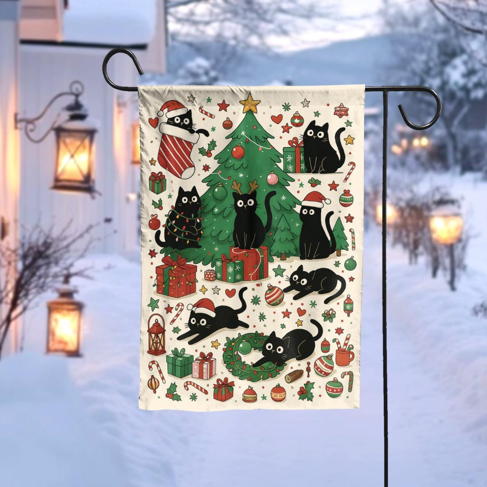 Christmas Black Cat Garden Flag, Holiday Outdoor Yard Decor, Cute Cat Christmas