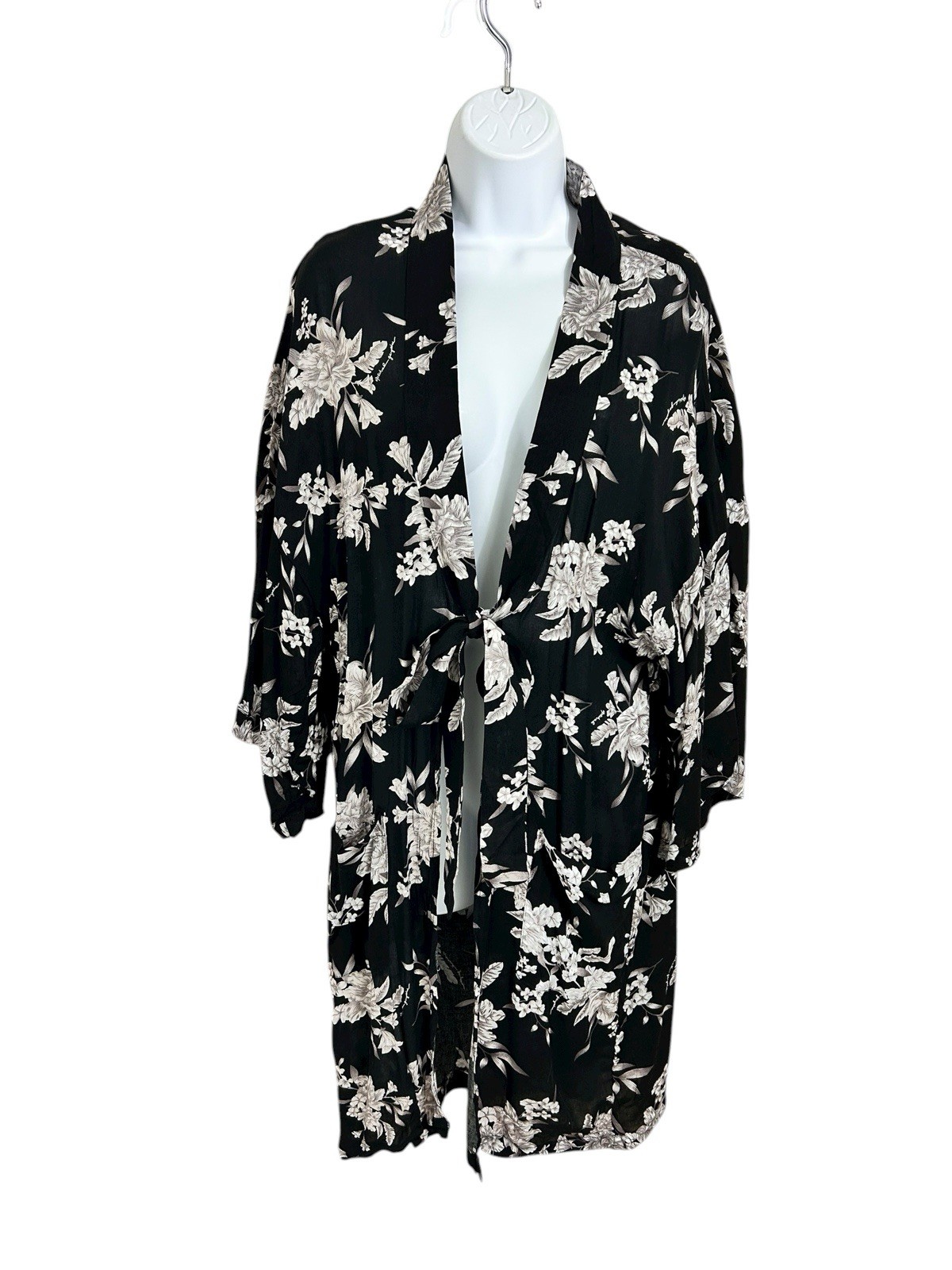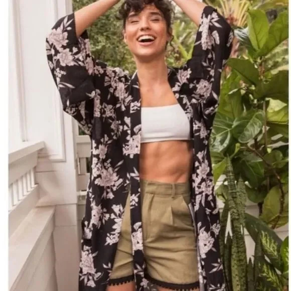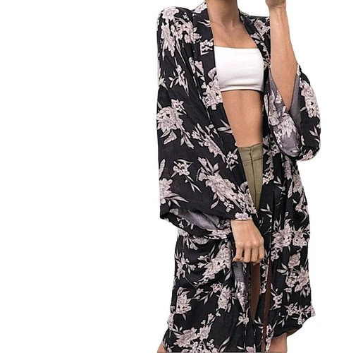 Spiritual Gangster Maya Kimono Robe Black Floral One Size Front Tie Lightweight