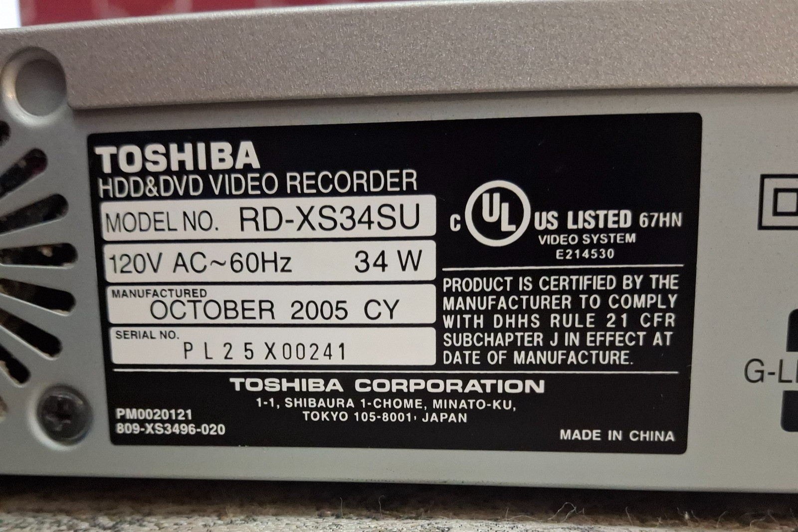 Toshiba RD-XS34SU HDD DVD Video Recorder Player RD-XS34 Silver 2005