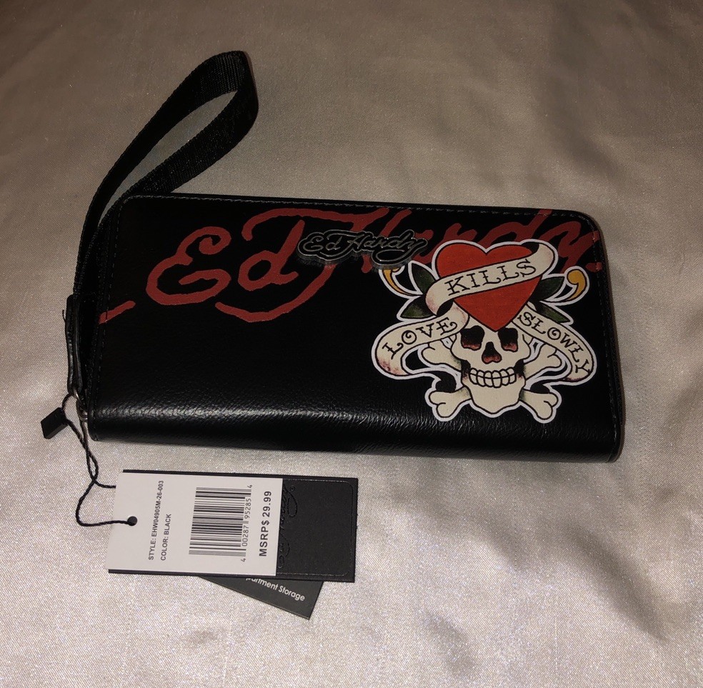 Ed Hardy Black Faux Leather ZA Wallet With Love Kills Slowly Tattoo NWT