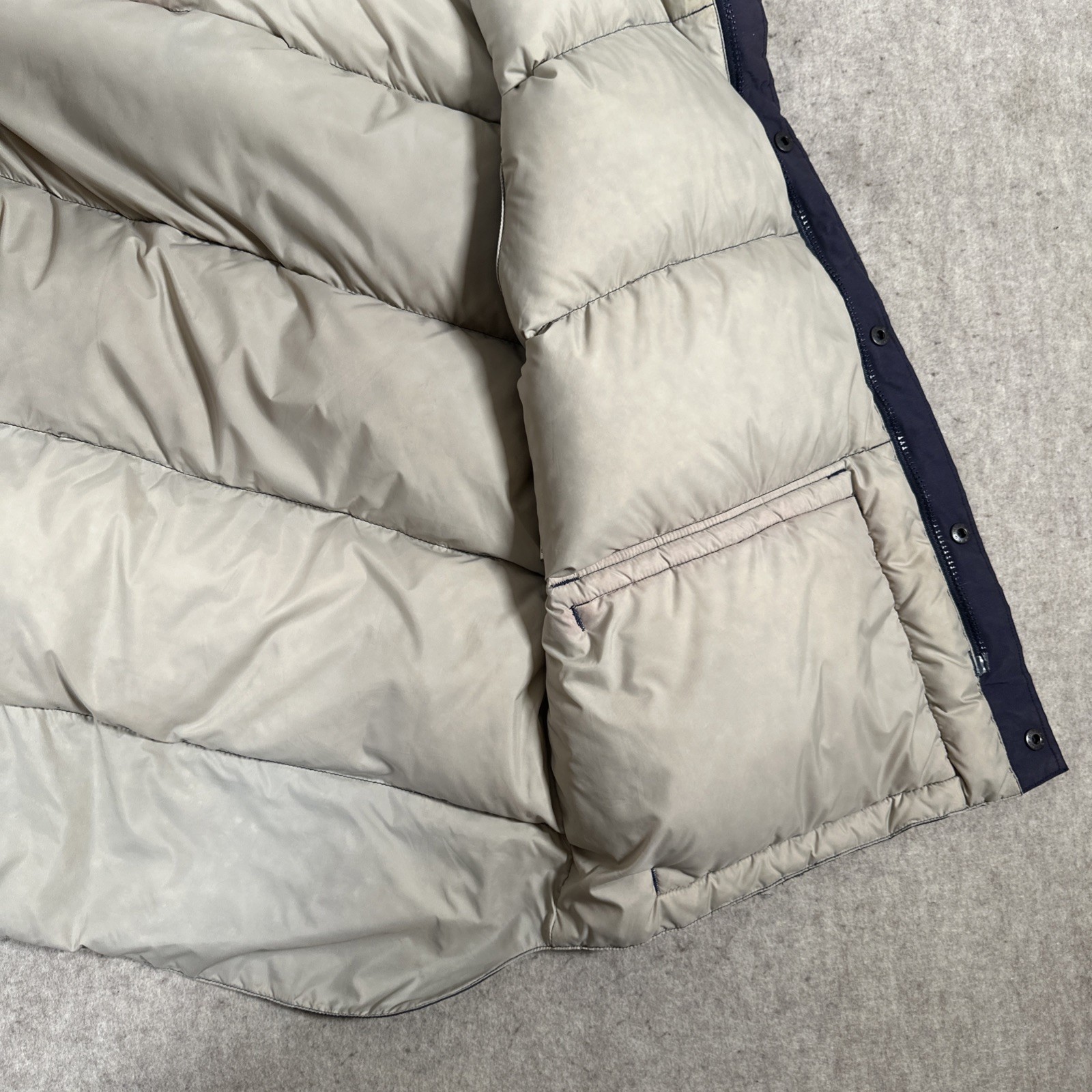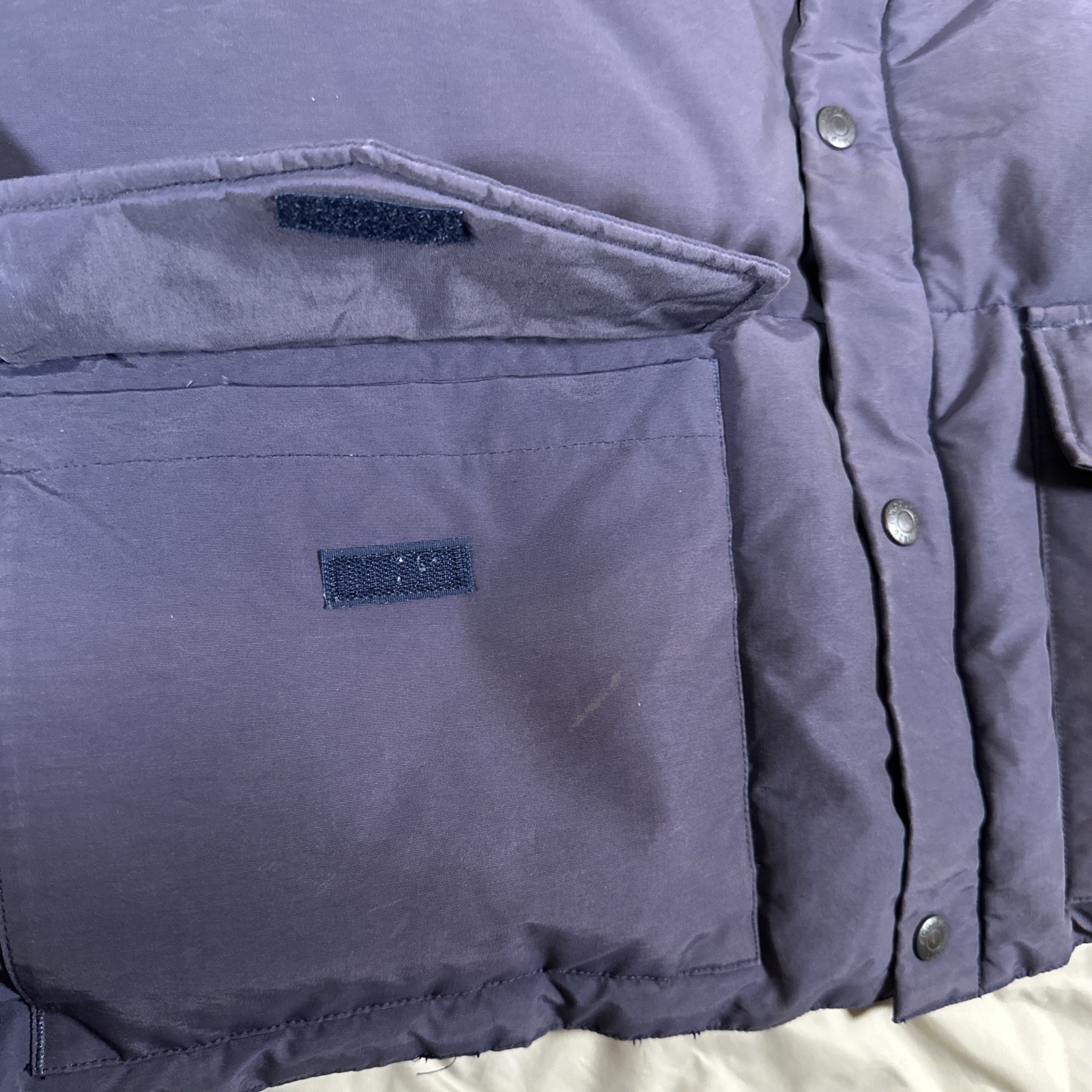 как выглядит VINTAGE Woolrich Goose Down Puffer Vest Mens Size Large Navy Blue Distressed фото