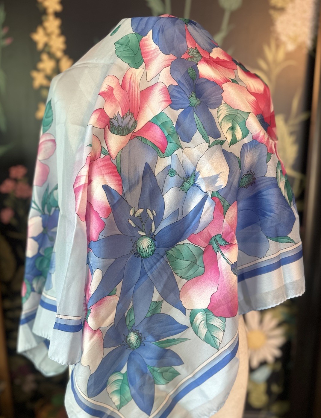 Vtg Floral Scarf Light Blue Semi Sheer Made in Italy wrap Large Square 34x34
