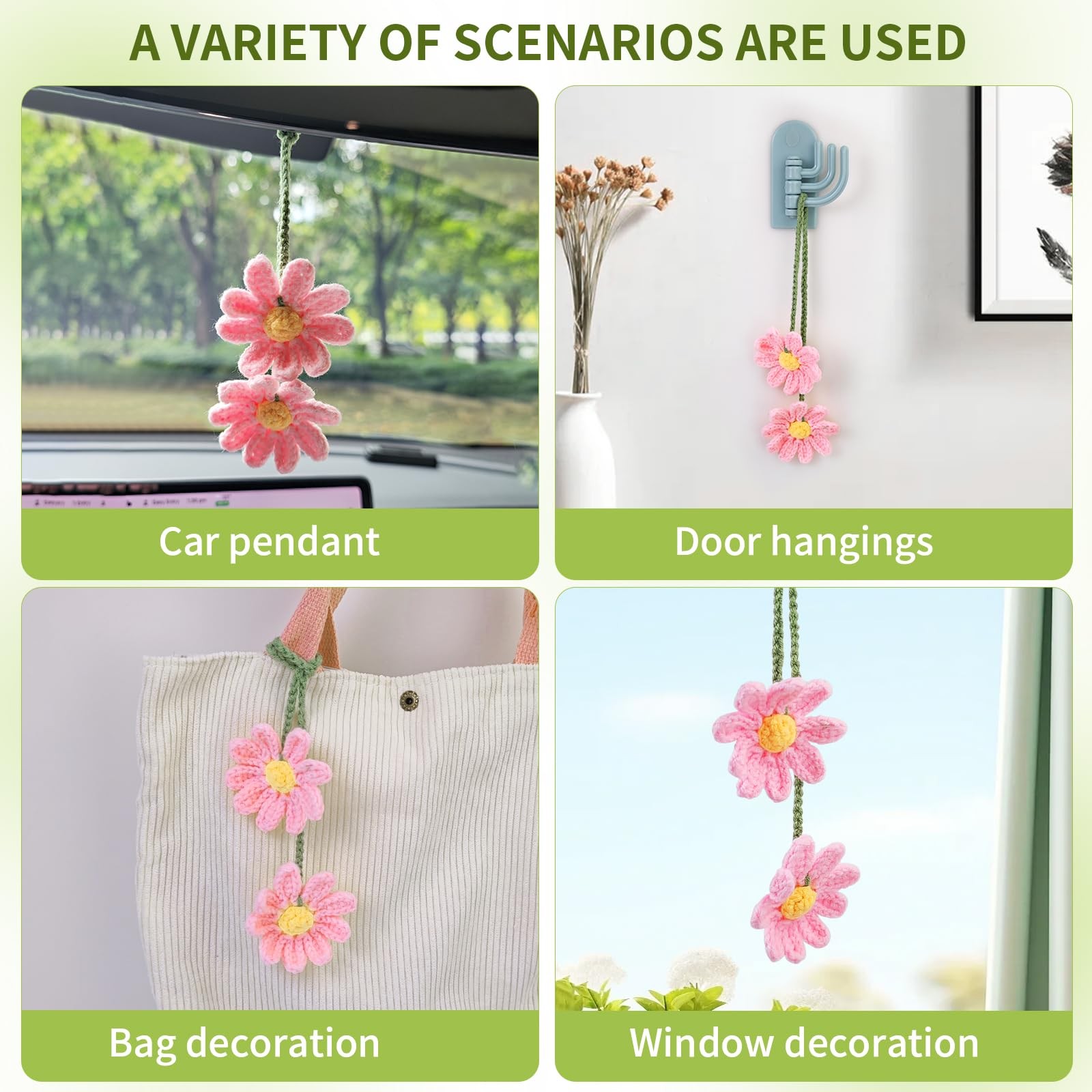 Crochet Double Daisy Pink Polyester Car Rear View Mirror Hanging Accessories,...