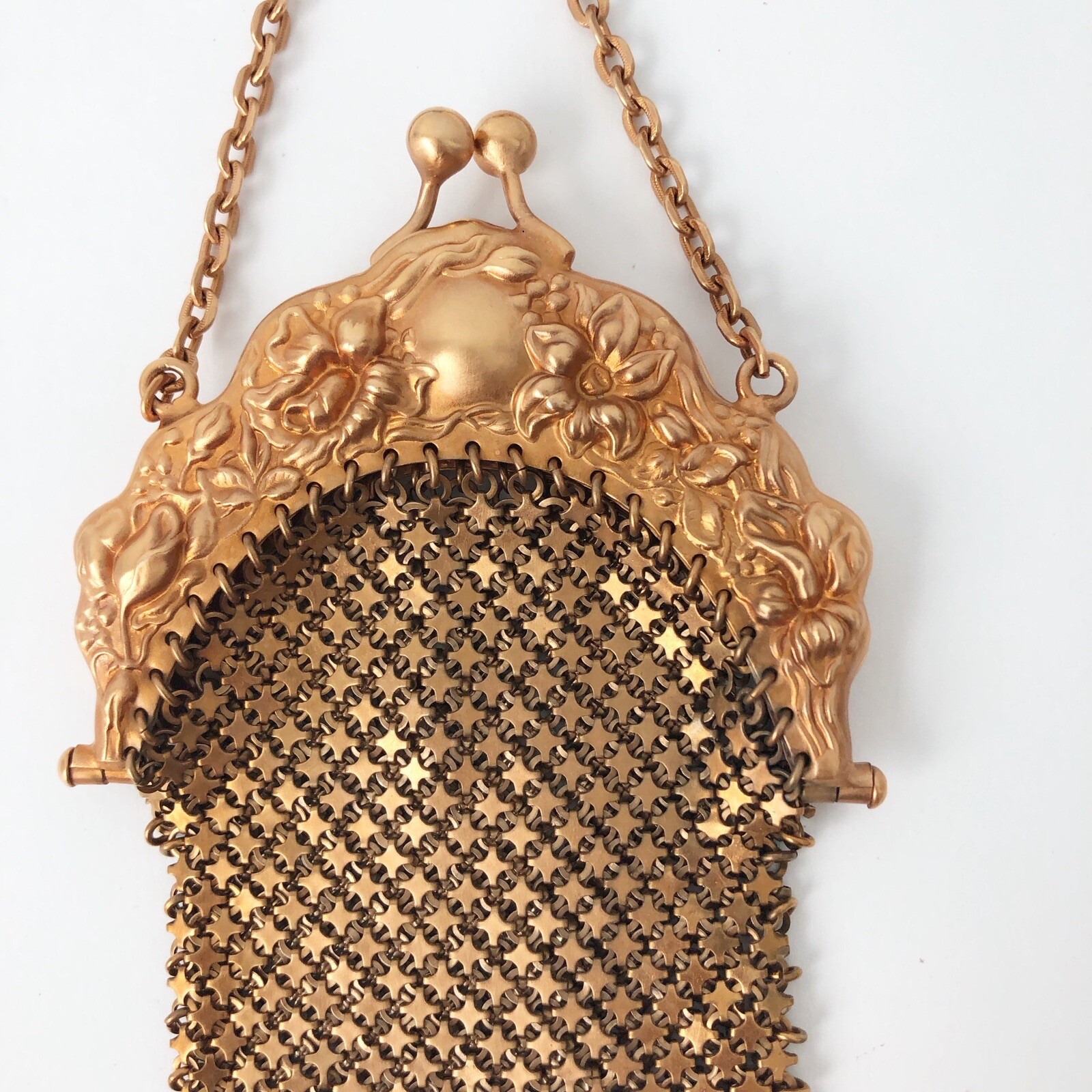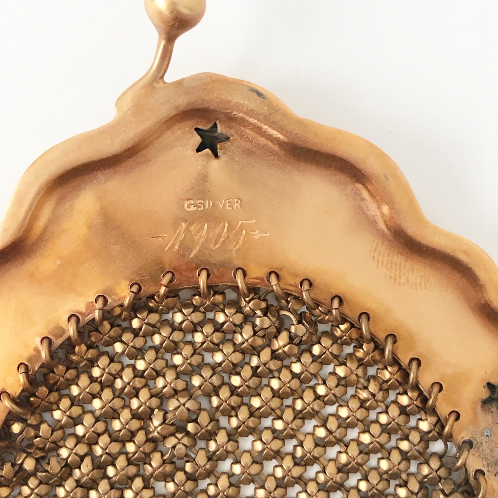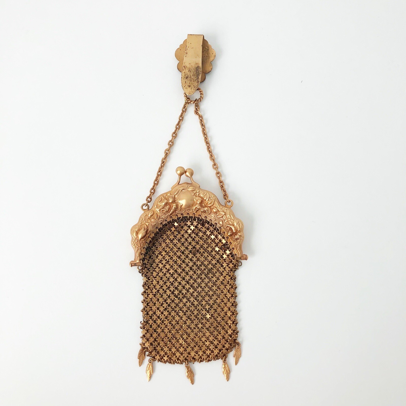 Antique Mesh Purse 1905 German Silver Art Nouveau Repousse Chatelaine Clip Gold