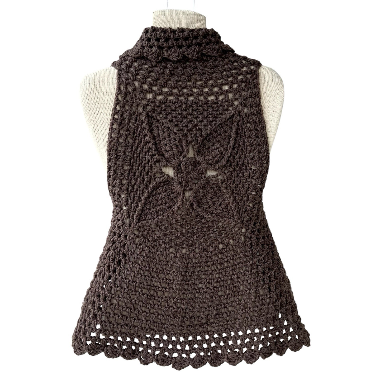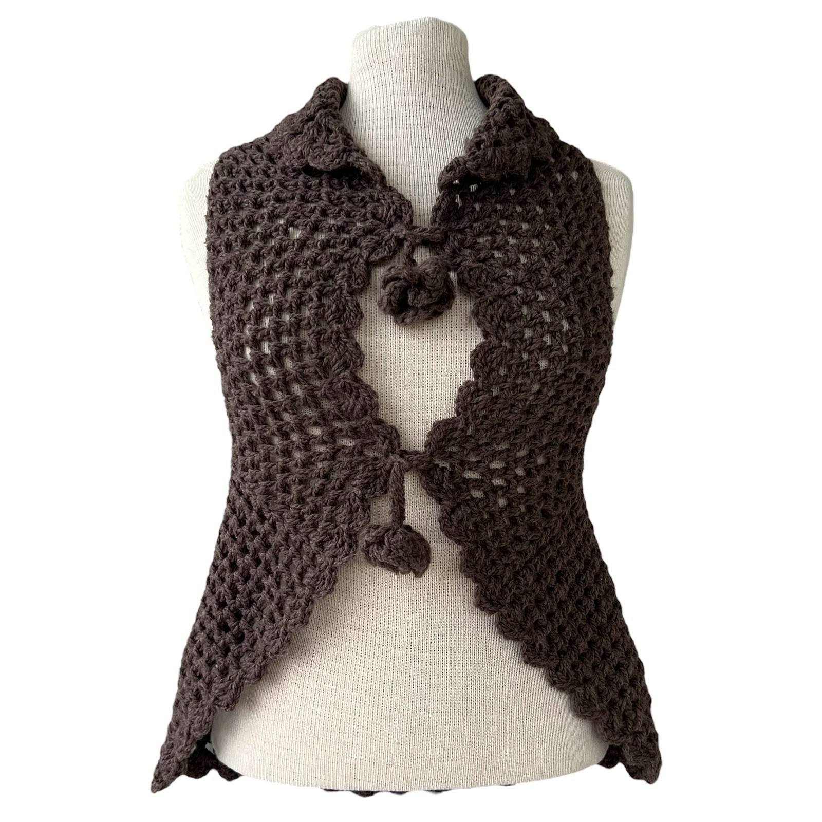 VINTAGE HANDMADE CROCHET BROWN KNIT VEST WITH ROSETTE STRING TIES