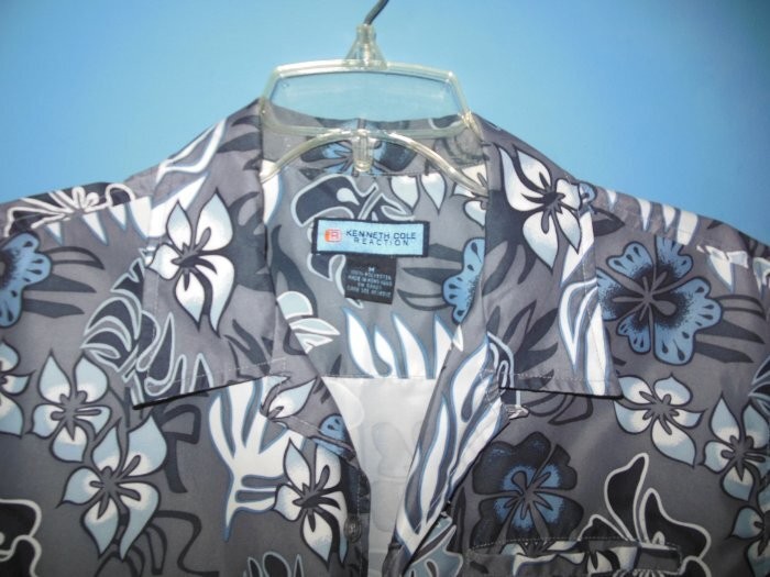 как выглядит Mens Kenneth Cole Reaction Gray Tropical Print Collared Shirt Medium фото
