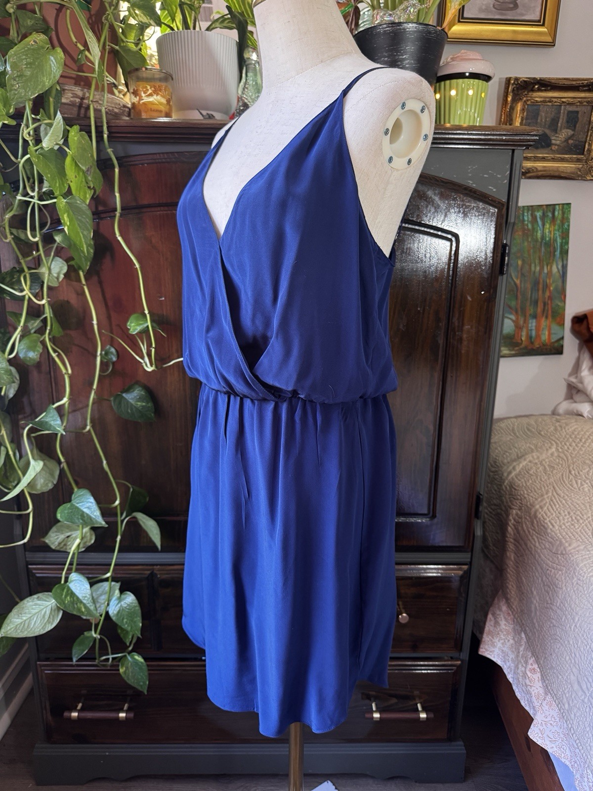 как выглядит Sz M VINTAGE Navy Blue 100 Silk Slip Mini Dress Tank Bloused 90 s Y2K Elastic фото