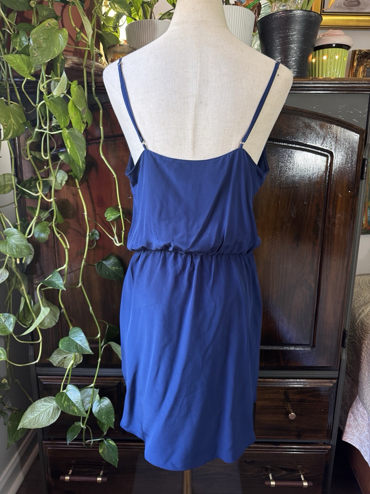Sz M VINTAGE Navy Blue 100 Silk Slip Mini Dress Tank Bloused 90 s Y2K Elastic