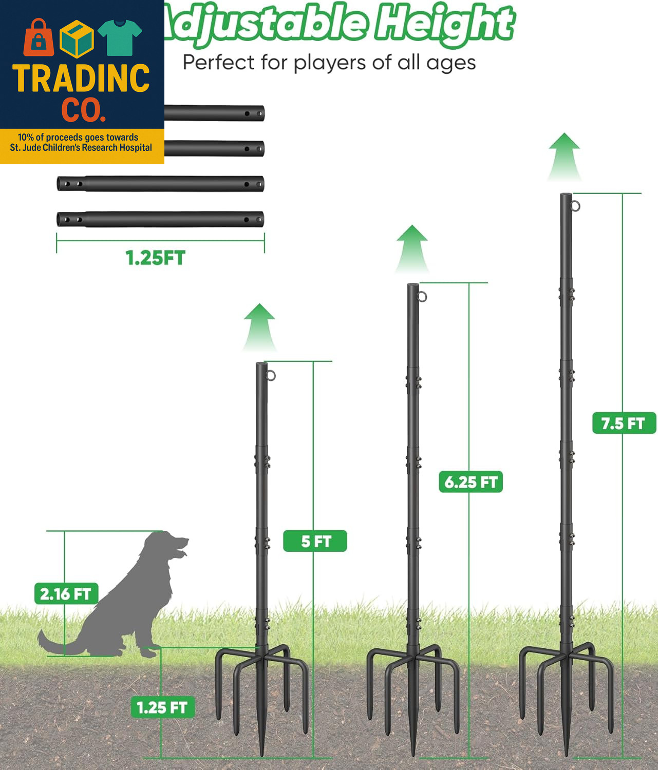 Included Components: 1 handy ball pump, 1 heavy-duty 14-inch in-ground base with in-gr
