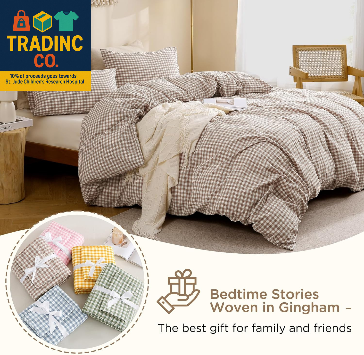 Tan Gingham Duvet Cover Bedding Set 100 Washed Cotton like Linen Feel Super Sof