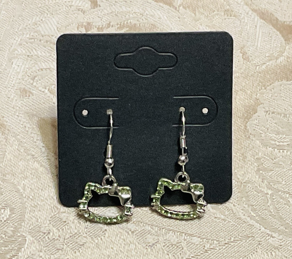 Hello Kitty Green Rhinestone Silver Charm Dainty Dangle Adorable Earrings