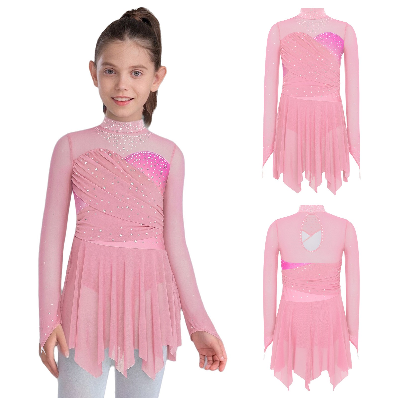 Kids Girls Dress Hem Dancewear Exercising Costume Figure Skating Sparkly Pa
