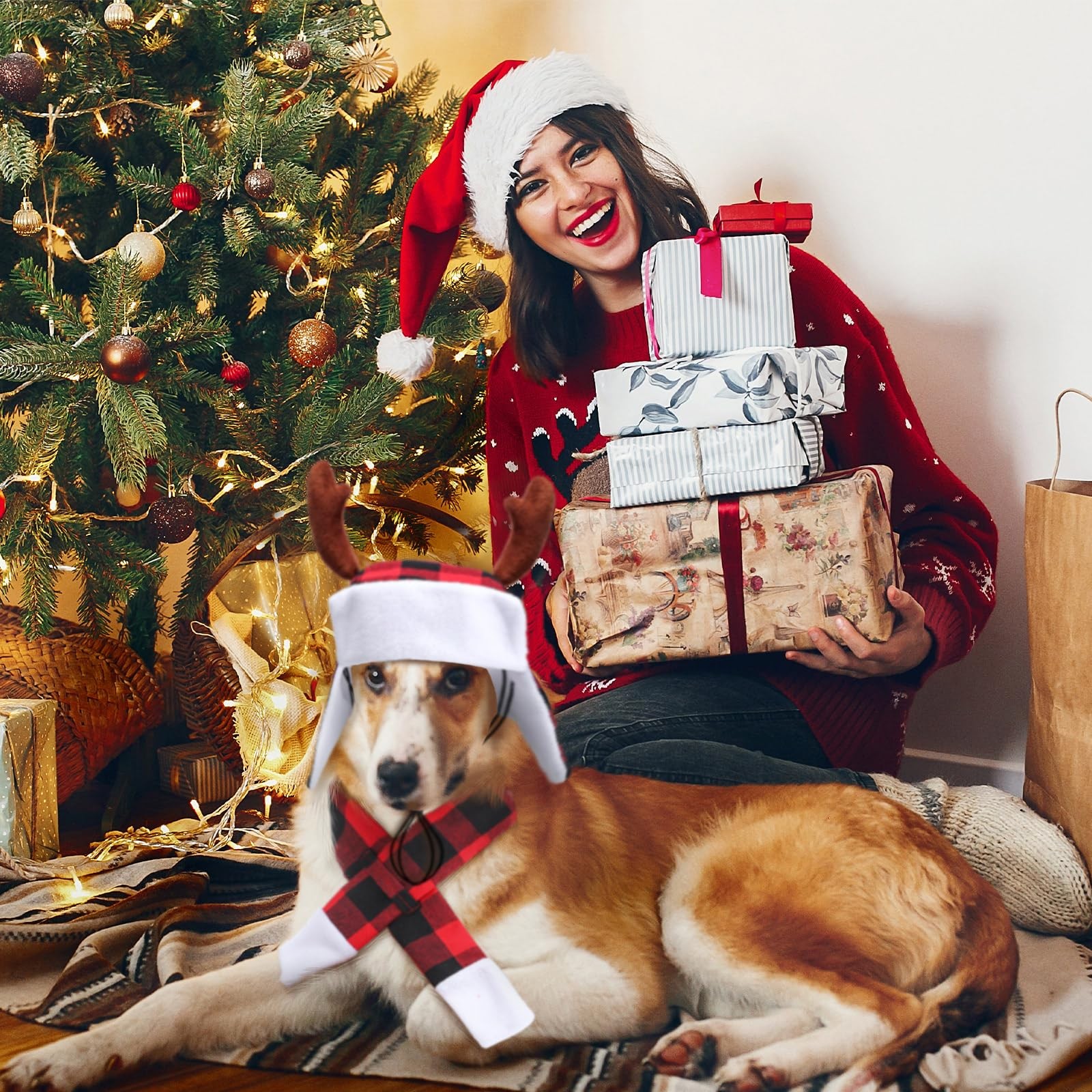 Shihanee 4 Pcs Santa Cap for Dog Christmas Scarf Medium to Large, Multicolor