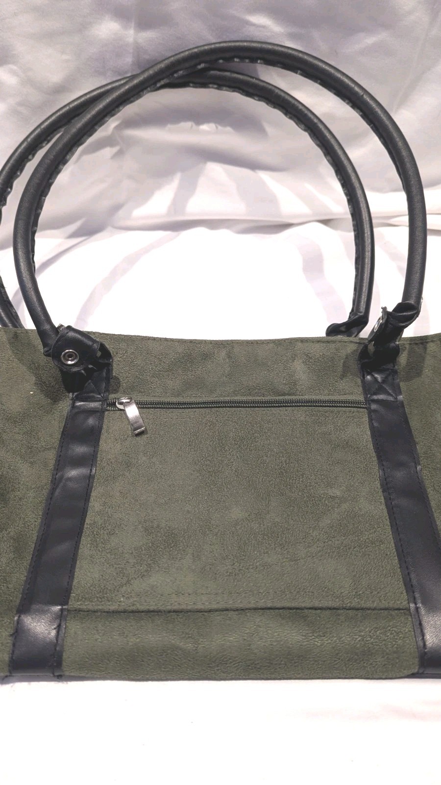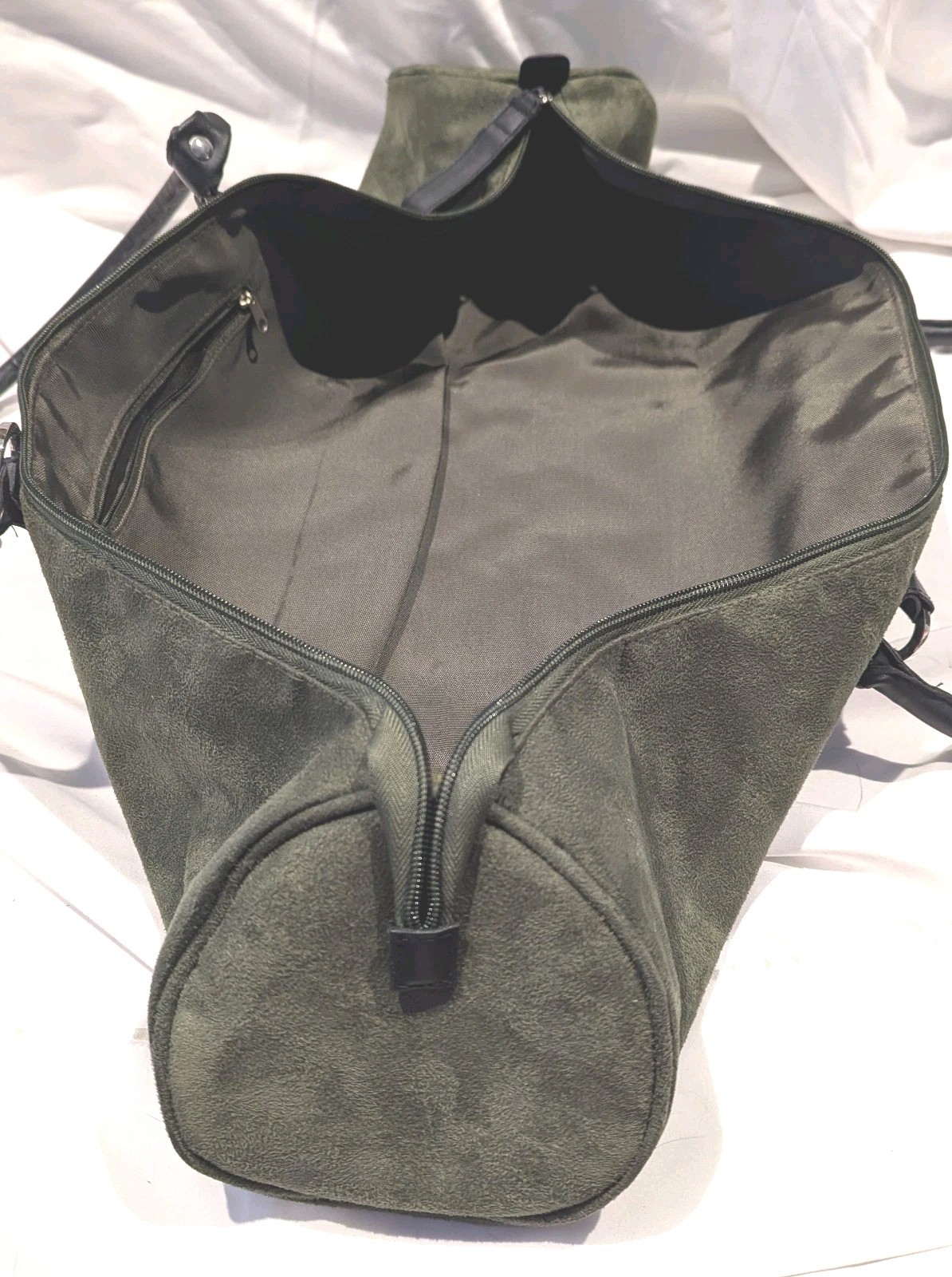 Green Suede Yoga Mat Bag with Large Size Open Pocket and Zipper. Black Straps.