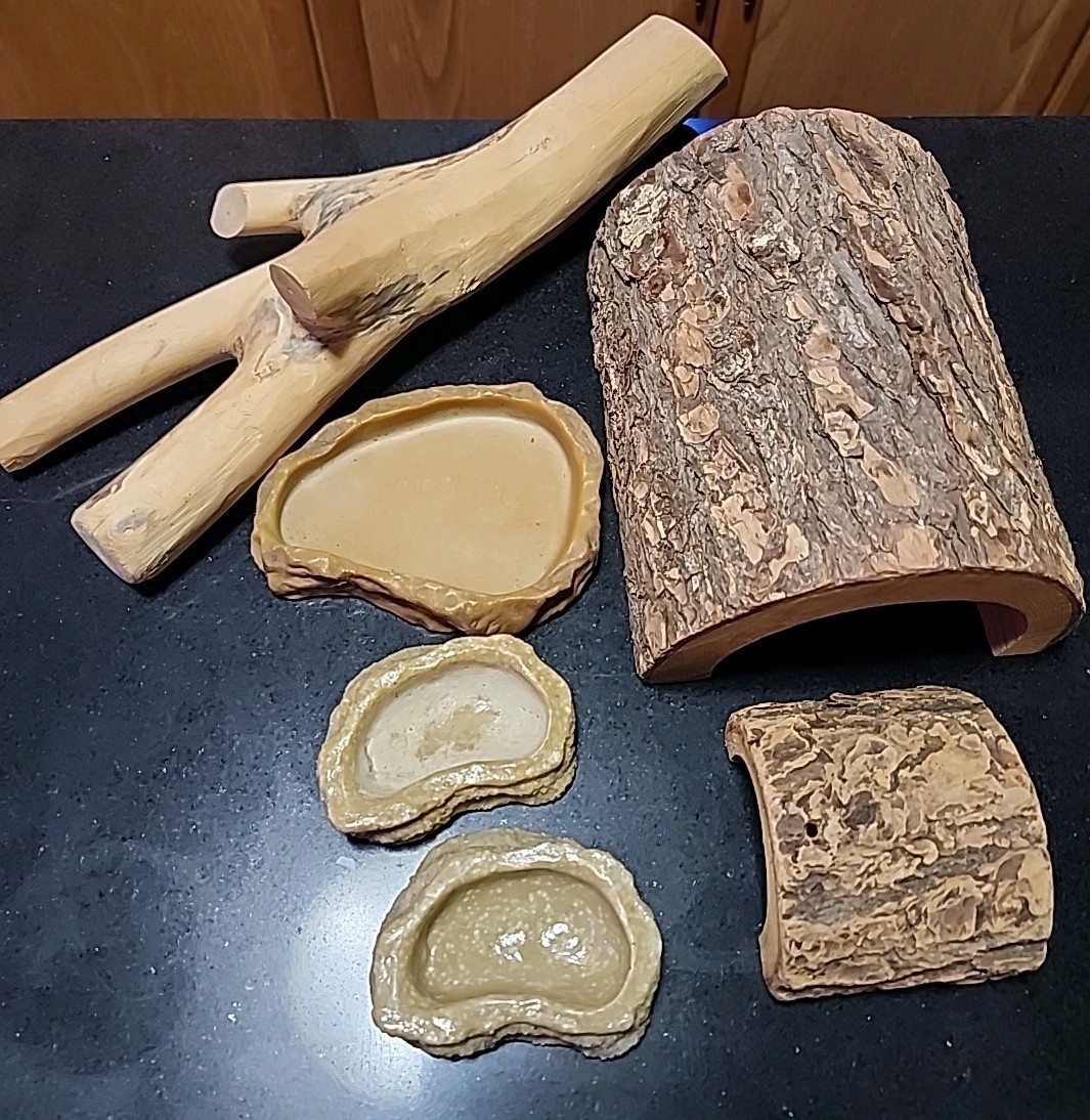 Reptile bundle- 2-Natural Wood Log Hides driftwood 3-Resin food water bowls