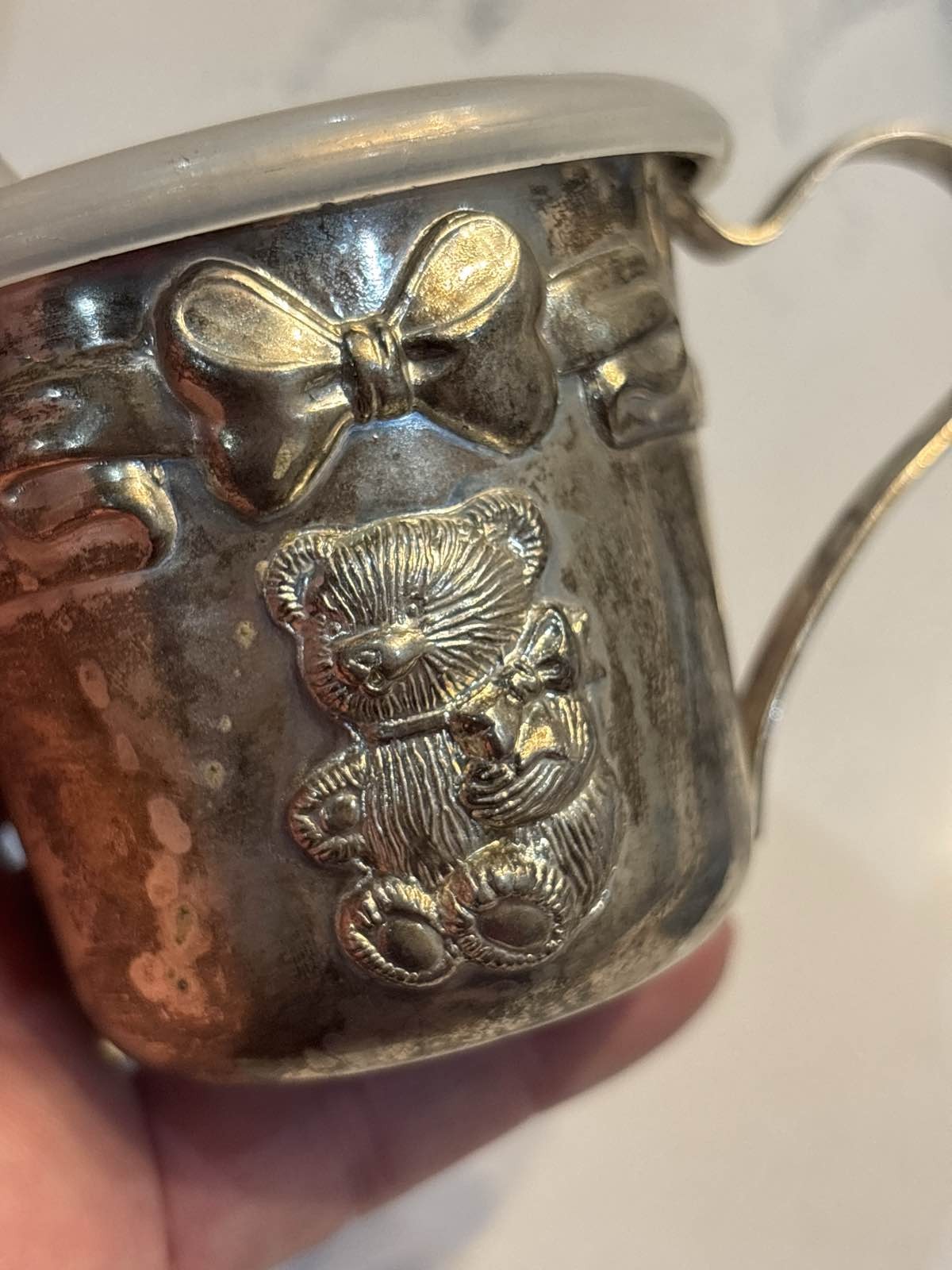 Silver Plated Baby Sippy Cup Teddy Bear Bow Embossed Plastic Lid Handle