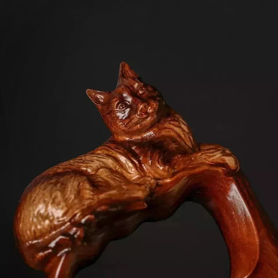 Hand craved cat handle wooden walking cane cat walking stick.