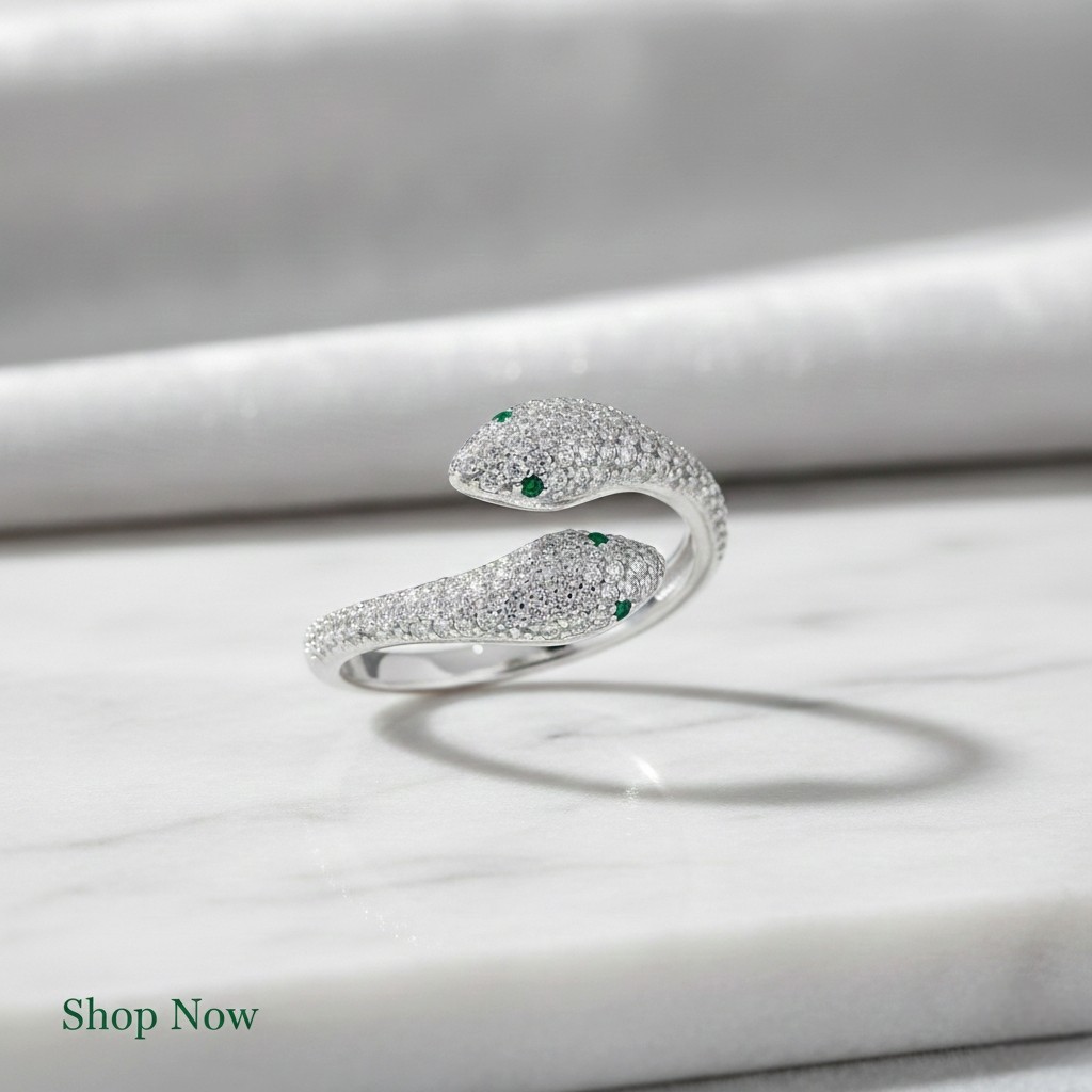 как выглядит Adjustable 925 Sterling Silver Double Snake Ring - Emerald Green Eyes фото
