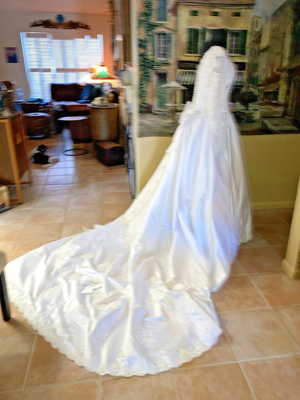 White Satin Vtg Wedding Gown Princess Puff Sleeve Bow Back Beaded Long Train 12
