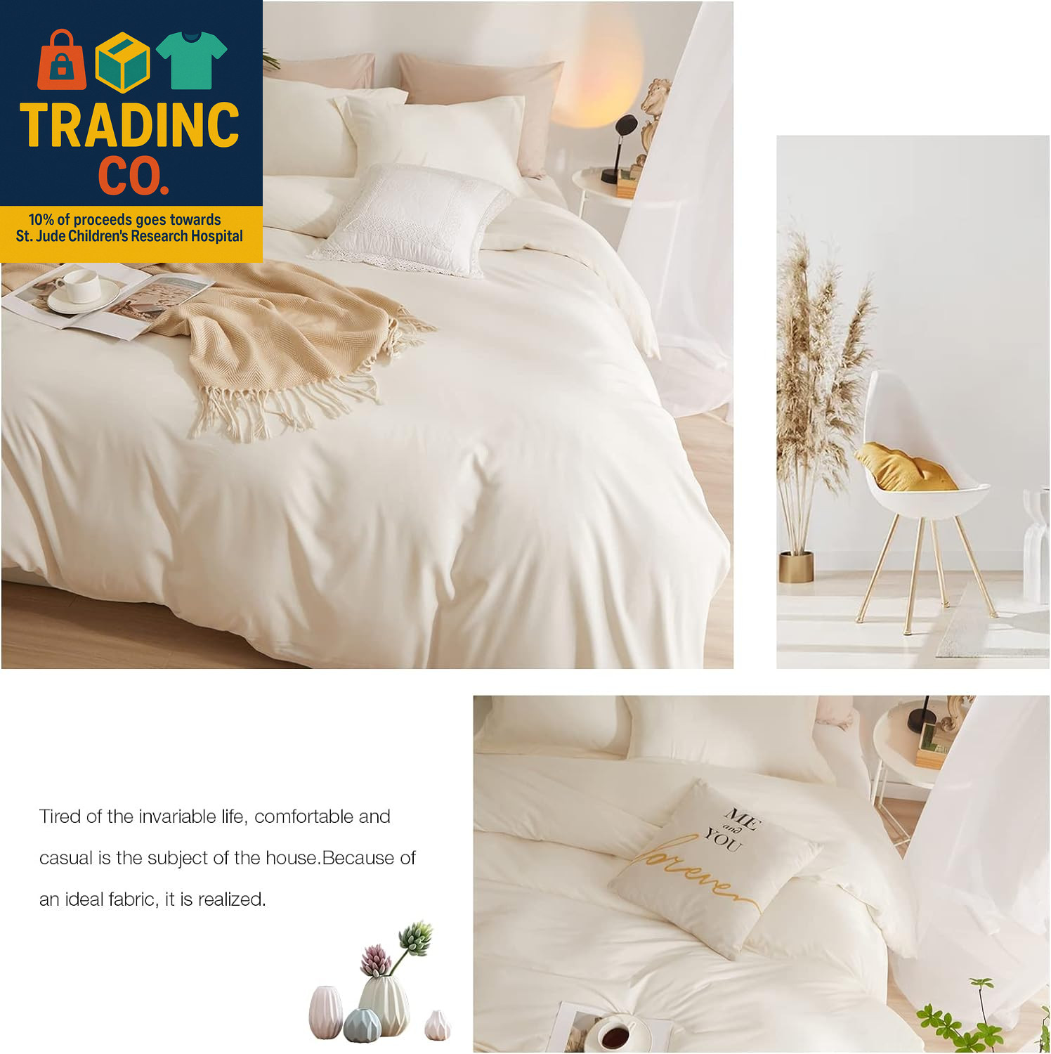 Boho 3 Pieces Queen Size Soft Washed Microfiber Cream White Duvet Cover Set with