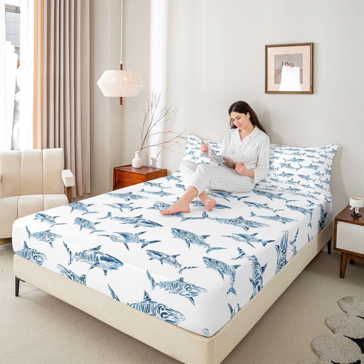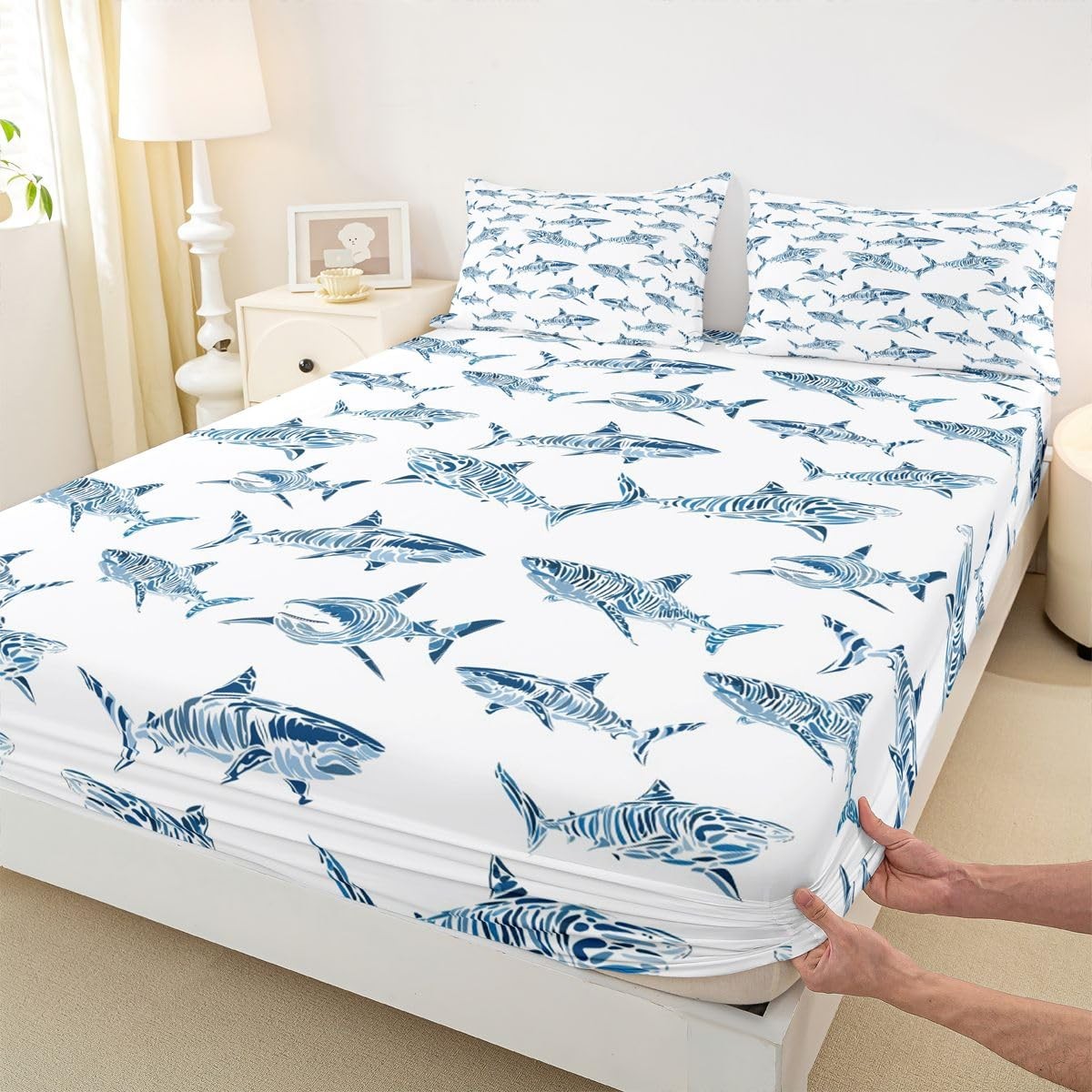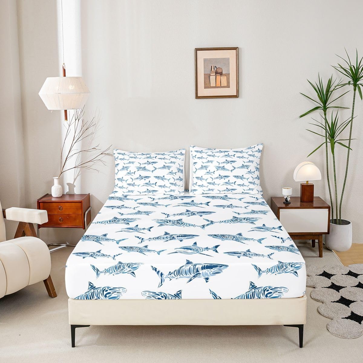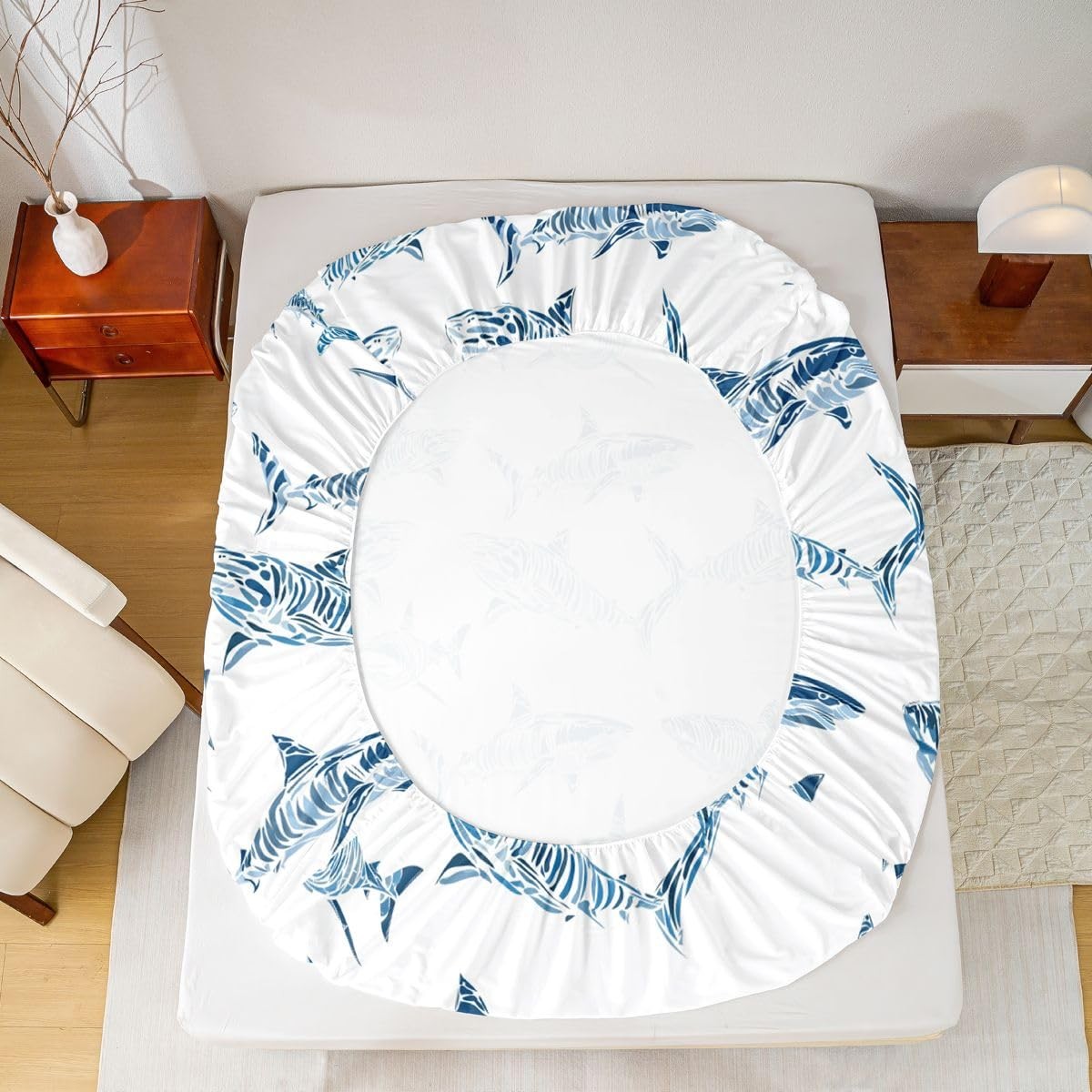Shark Bed Sheets Twin Ocean Life Fitted Sheet for Child Boys Blue Watercolor ...