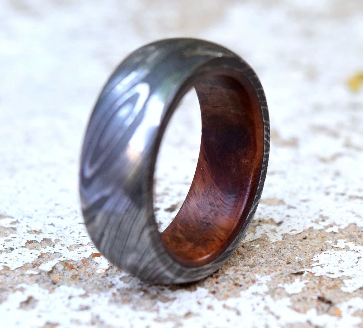как выглядит SIZE 9 Hand Forged Gunmetal Damascus Steel Ring Mens Engagement Wood Sleeve 8mm фото