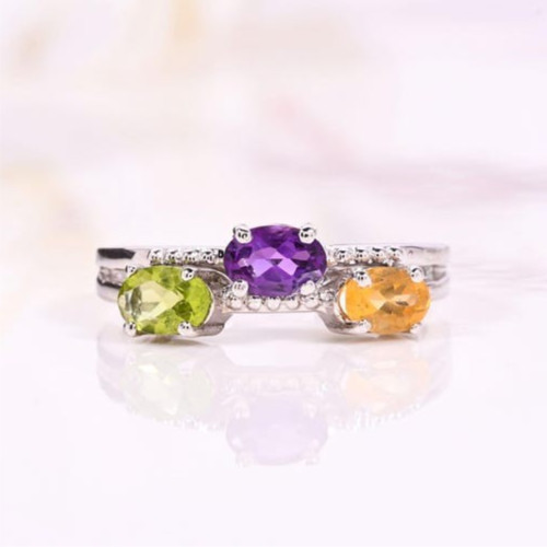 Amethyst Peridot Citrine Ring 925 Sterling Silver Three Stone Birthstone Jewelry