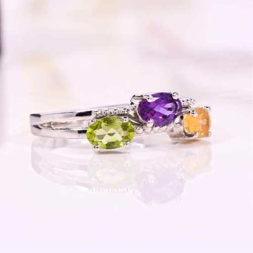 • Amethyst Peridot Citrine Ring 925 Sterling Silver Three Stone Birthstone Jewelry