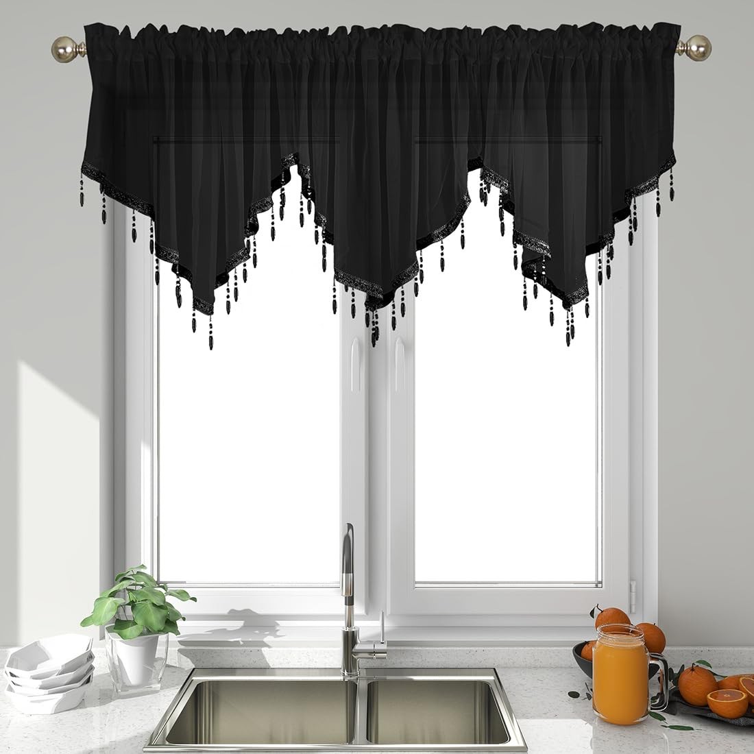 как выглядит JAIJY Sheer Beaded Ascot Semi Voile Solid 51"W x 23"L Pack of 3 , Black фото