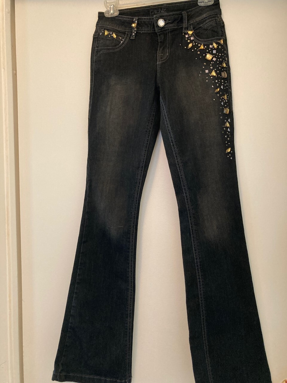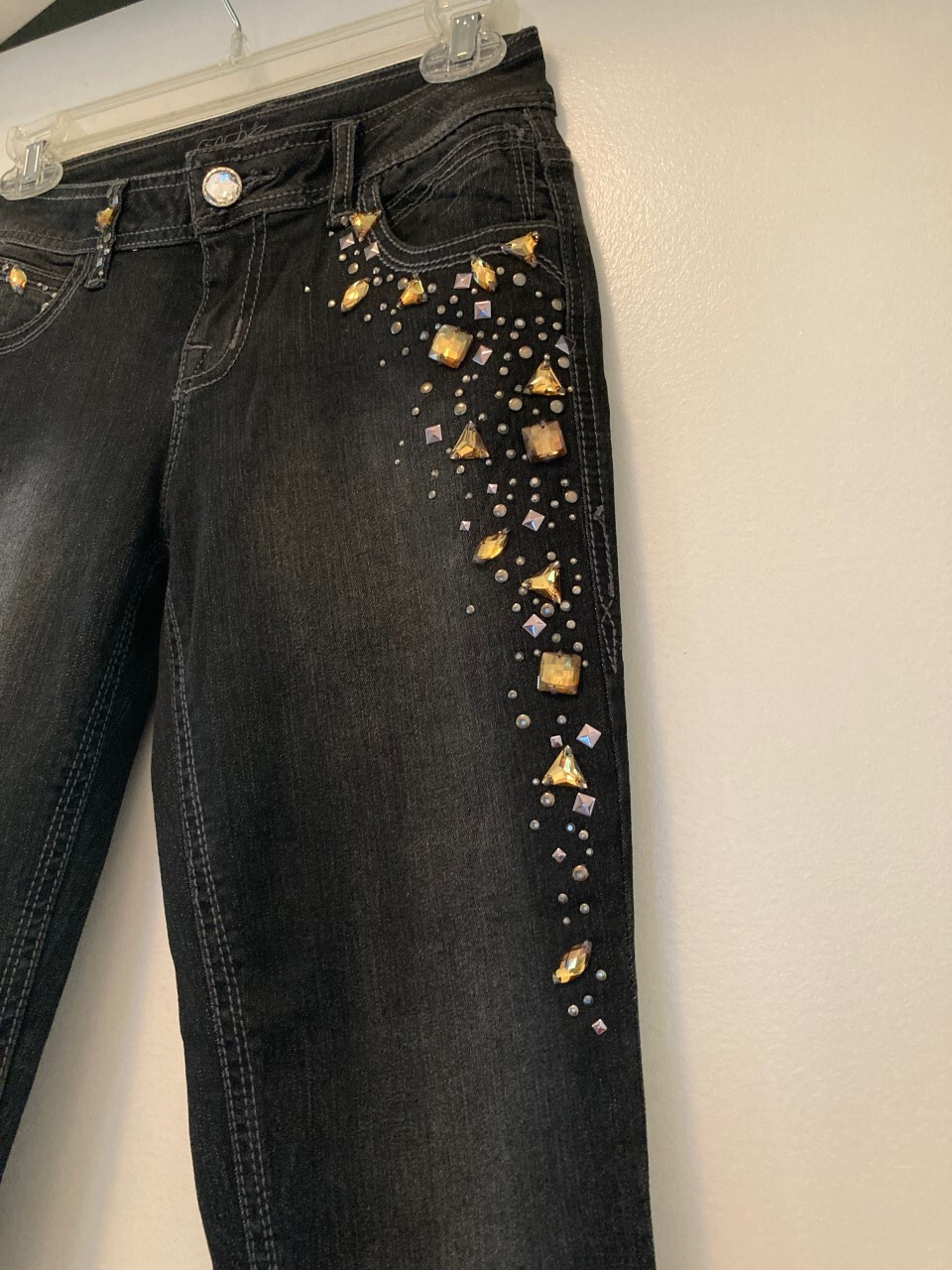 как выглядит Cache Black Distressed Denim Crystal Stud-Embellished Jeans  New With Tags фото