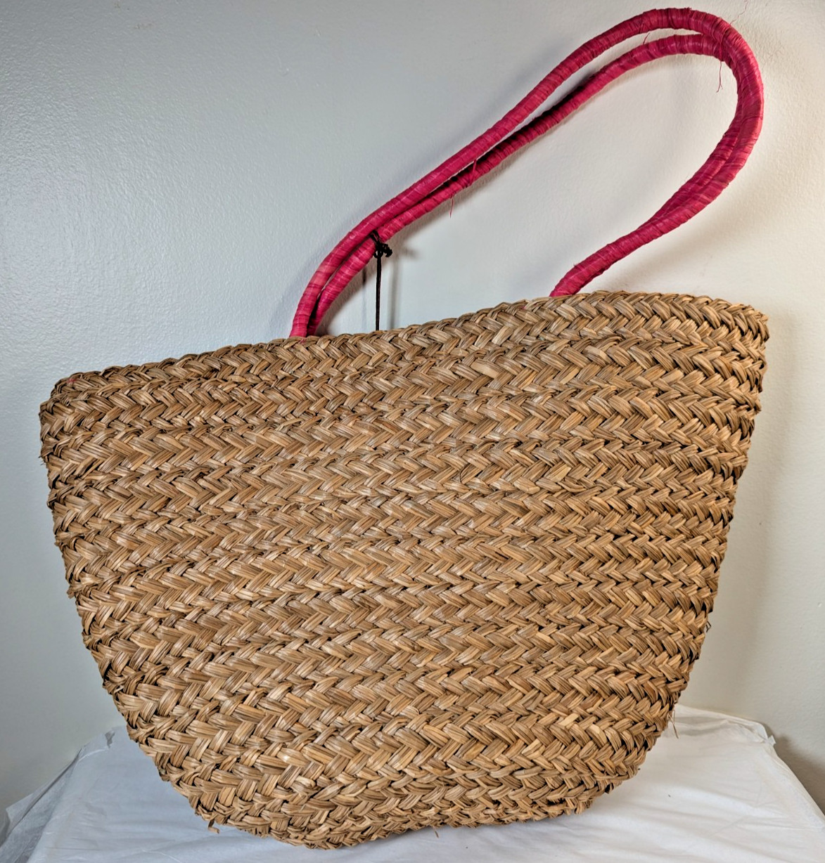 Vintage Sun N Sand Woven Straw Beach Bag Pink Flower Detail Double Handle Tote