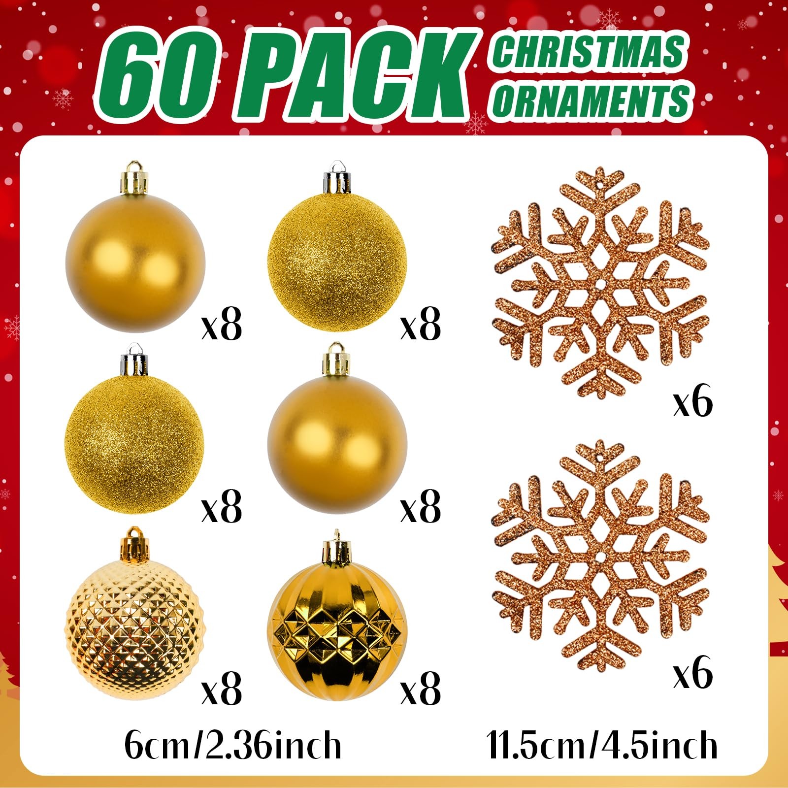 Christmas Tree Decorations Ornament Set, 60ct 2.36 Inches Gold