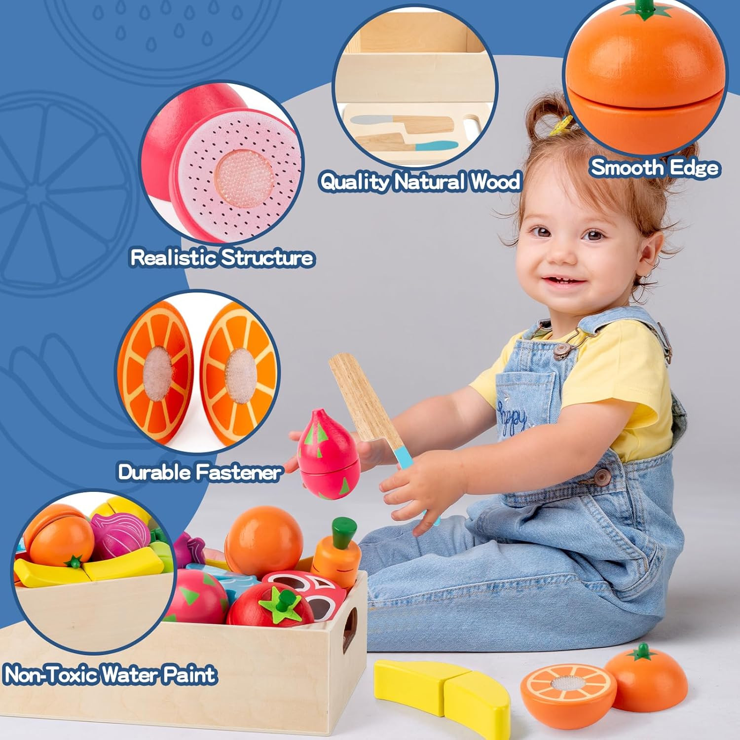 32 Pcs Wooden Play Food Sets for Kids Kitchen Accessories, Montessori Educationa