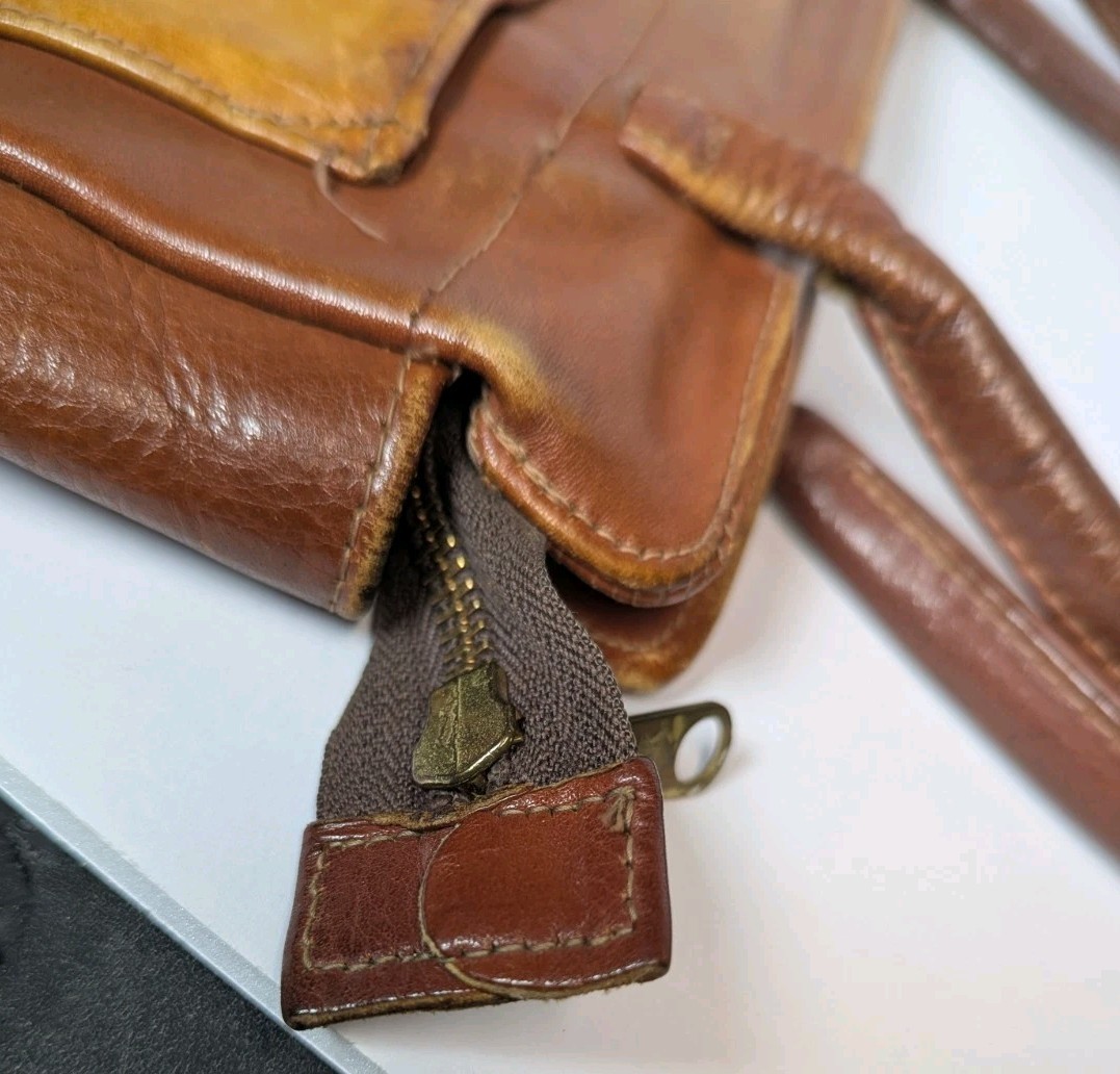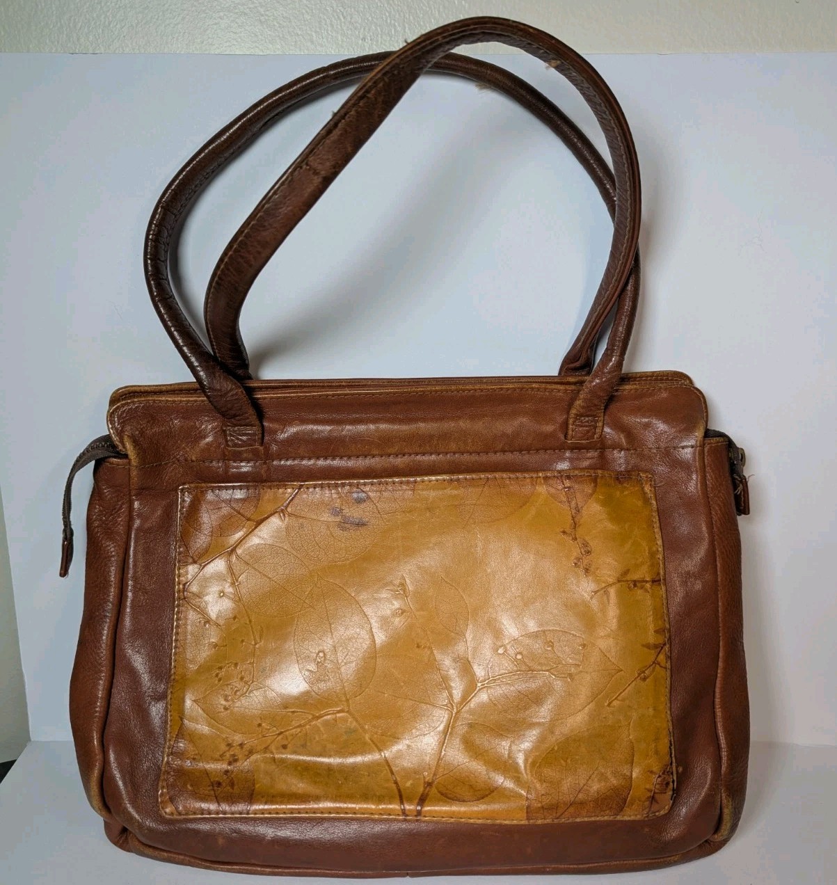 Women's Vintage Two Tone Brown Leather Hand Crafted Embossed Leaf Design Handbag