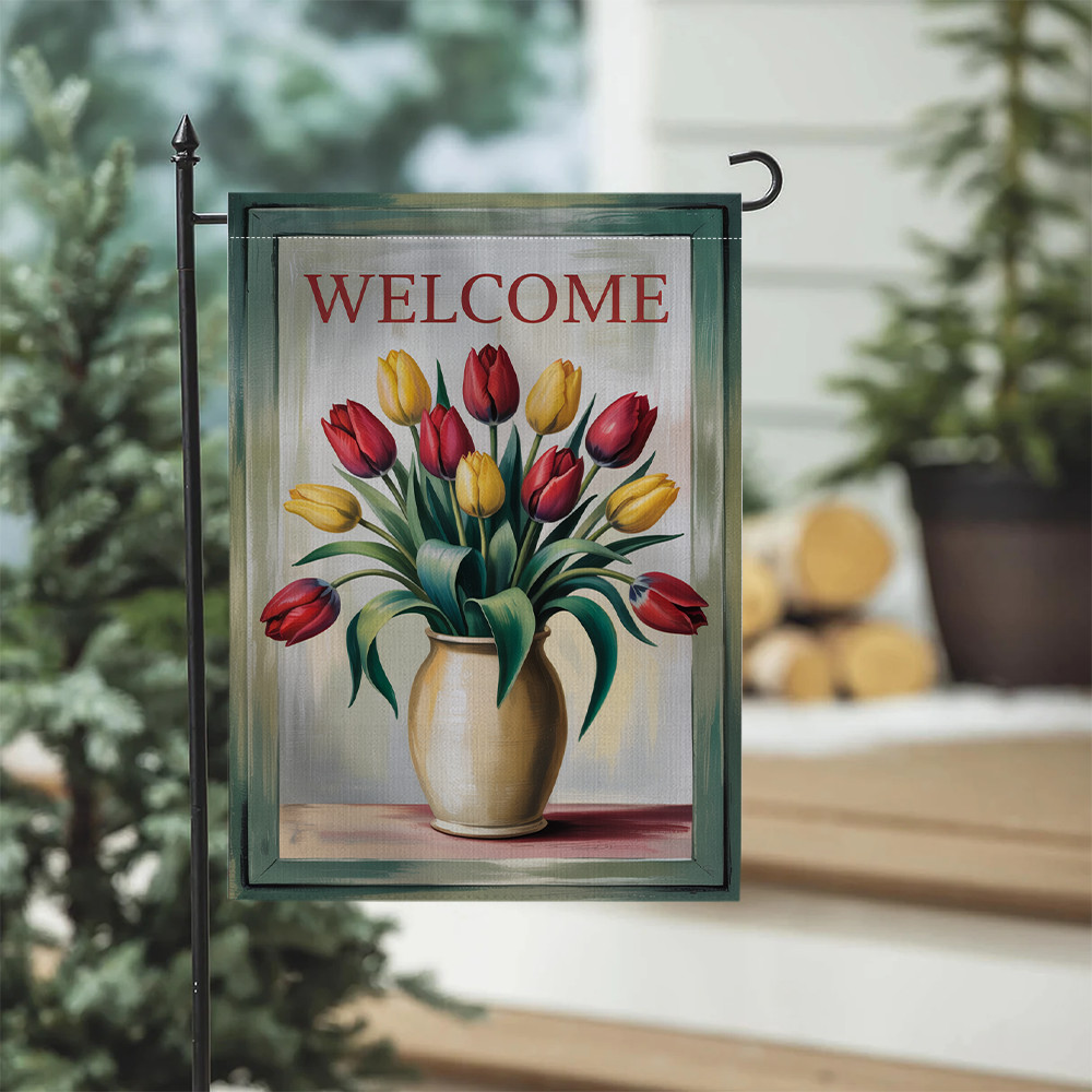 Welcome Garden Flag Tulip Flower Bouquet Vase Yard Decor Outdoor Banner Vertical